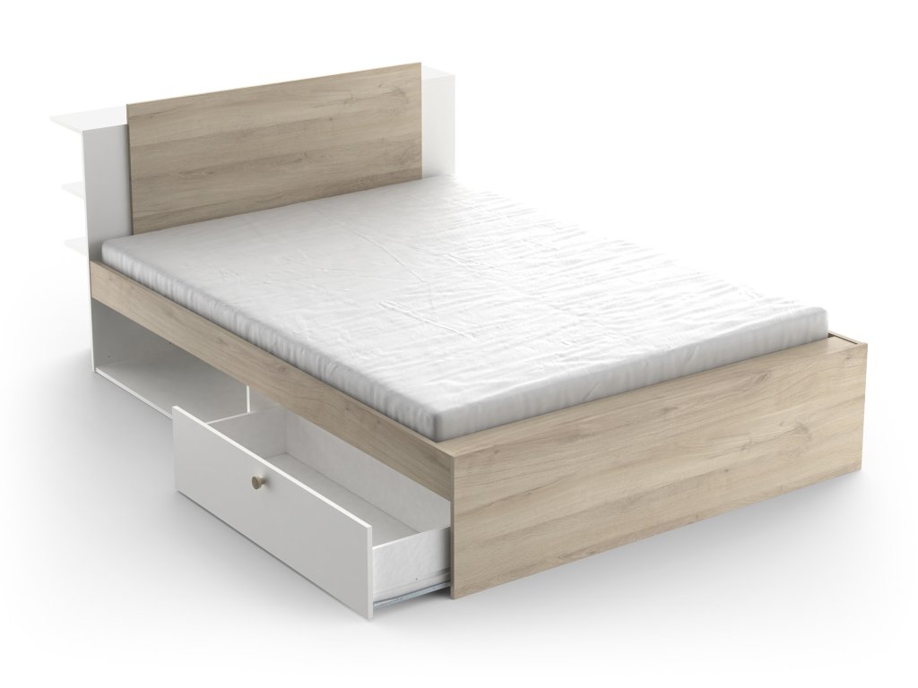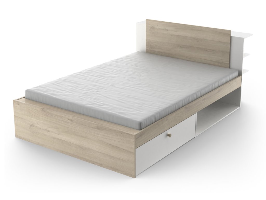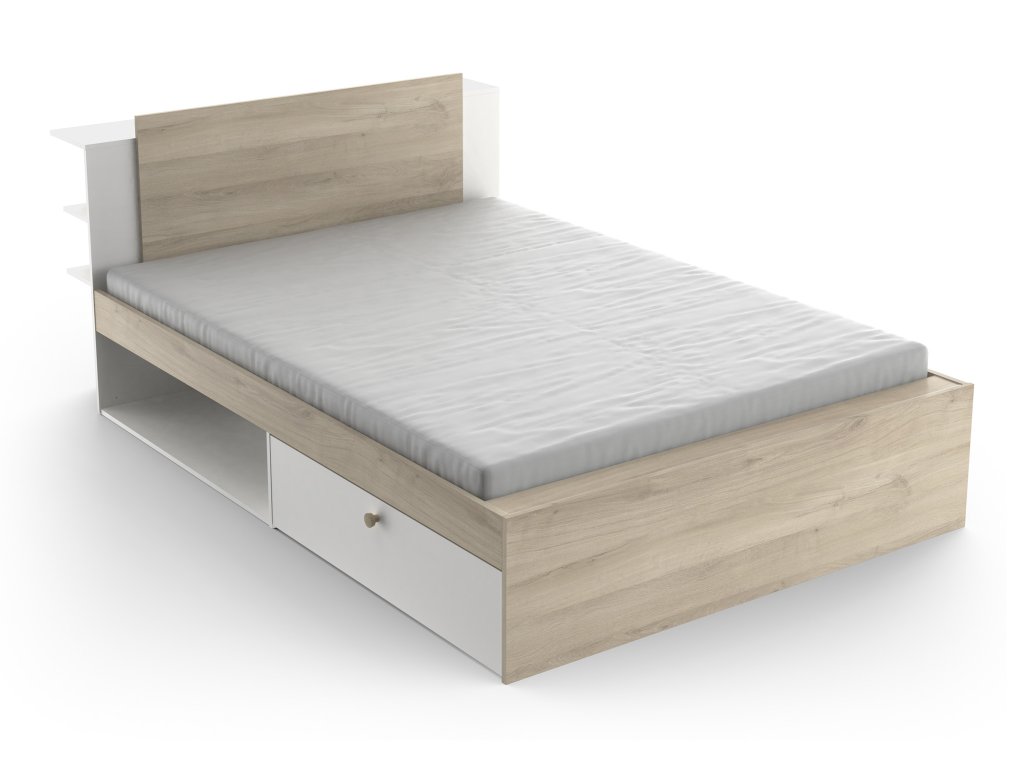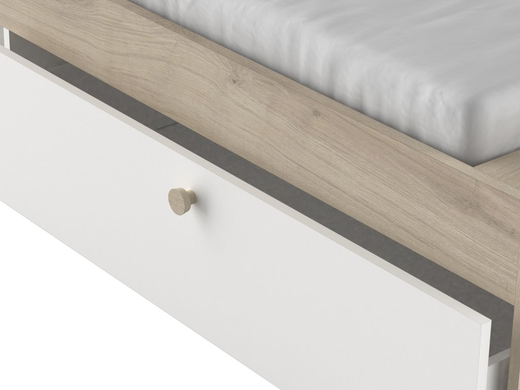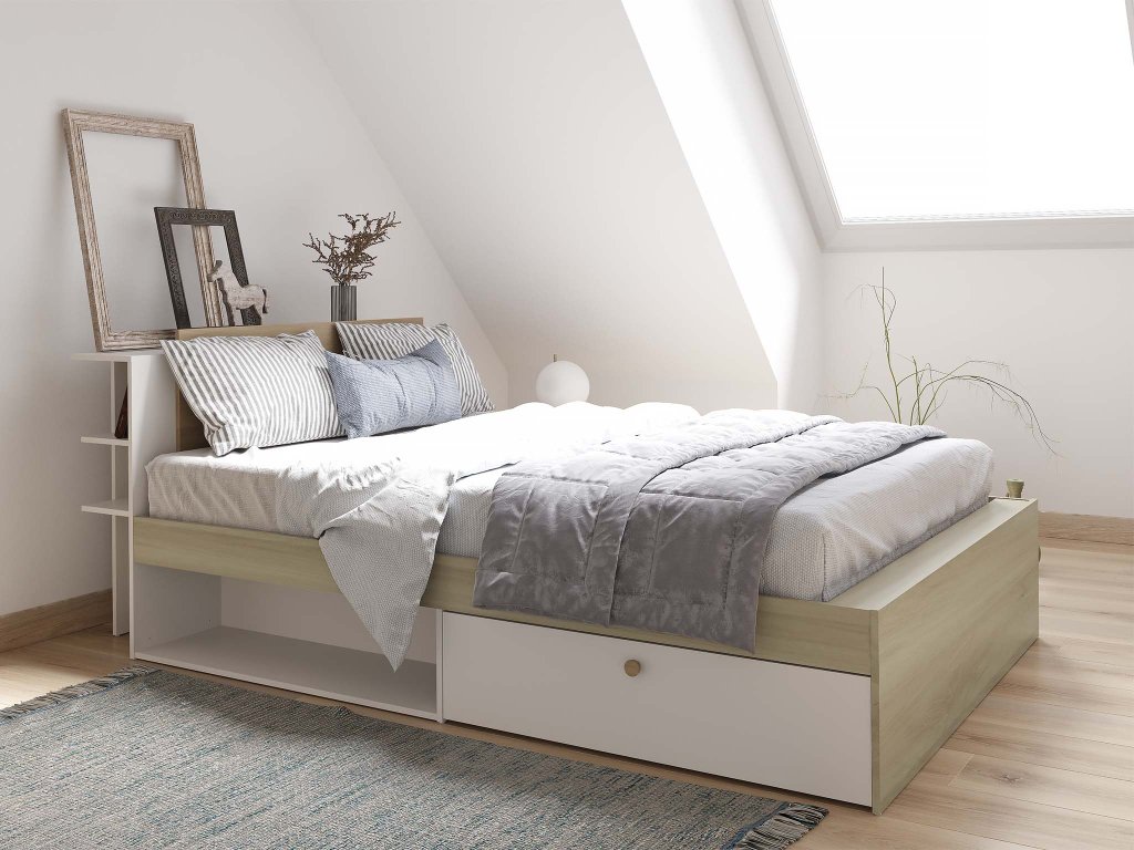 Posteľ Teya v kombinácii bielej farby a dekoru duba je moderným a zároveň praktickým riešením do menších spální, študentských alebo hosťovských izieb. Elegantné spojenie svetlej bielej a prírodného odtieňa dreva pôsobí nadčasovo a jednoducho sa kombinuje s iným nábytkom.