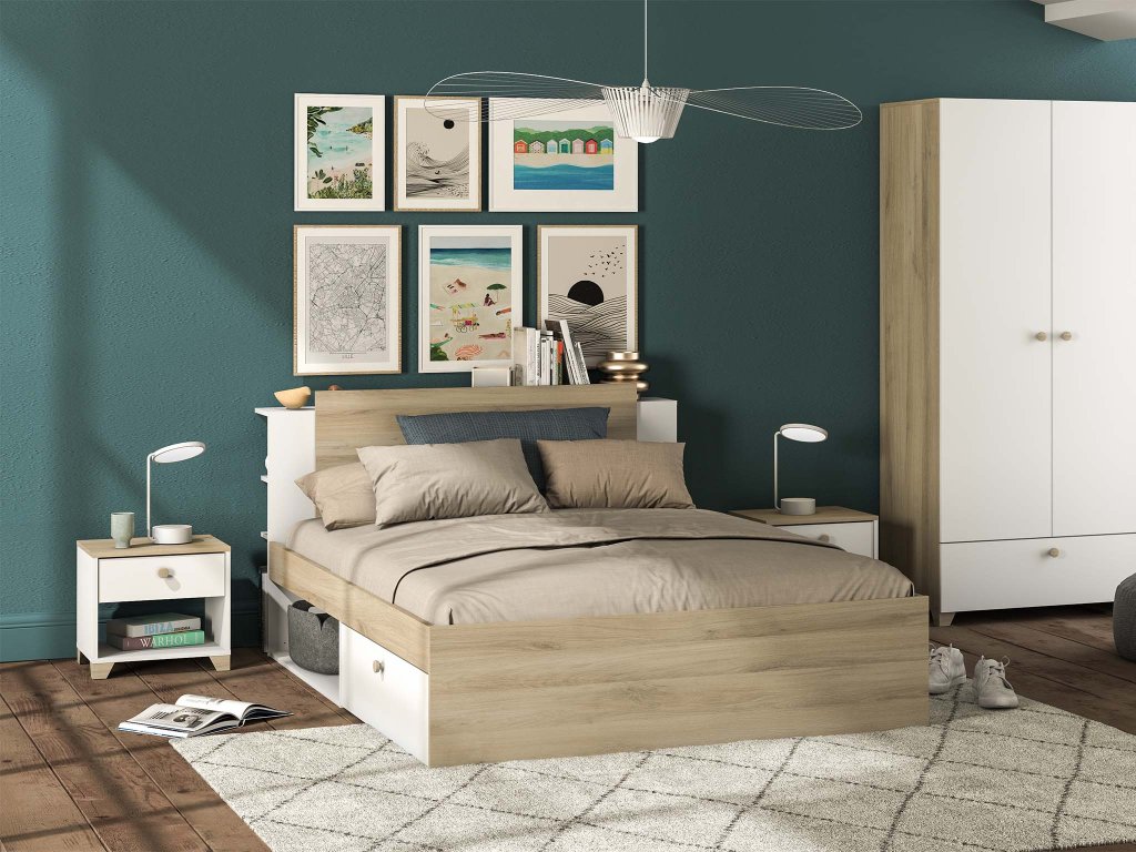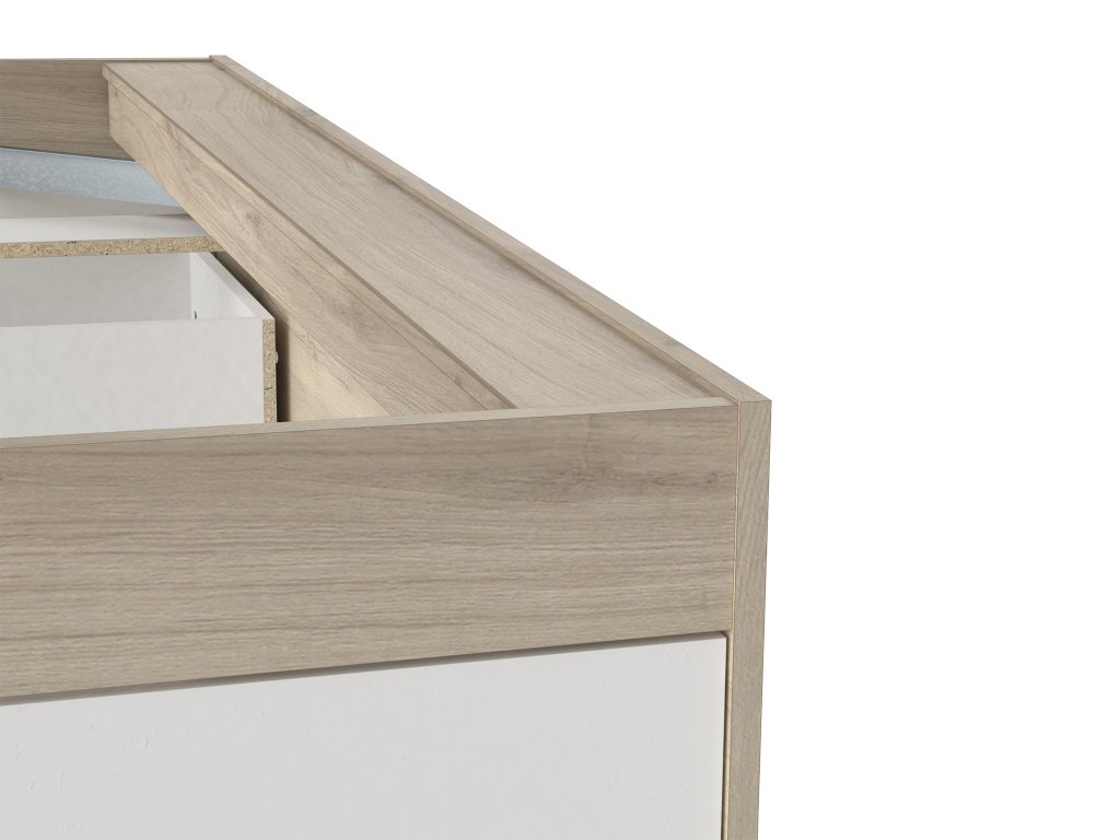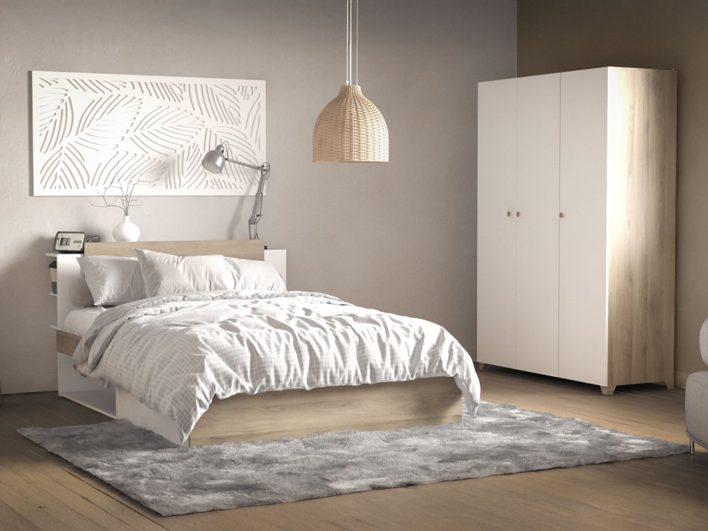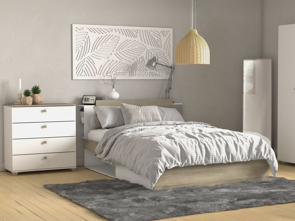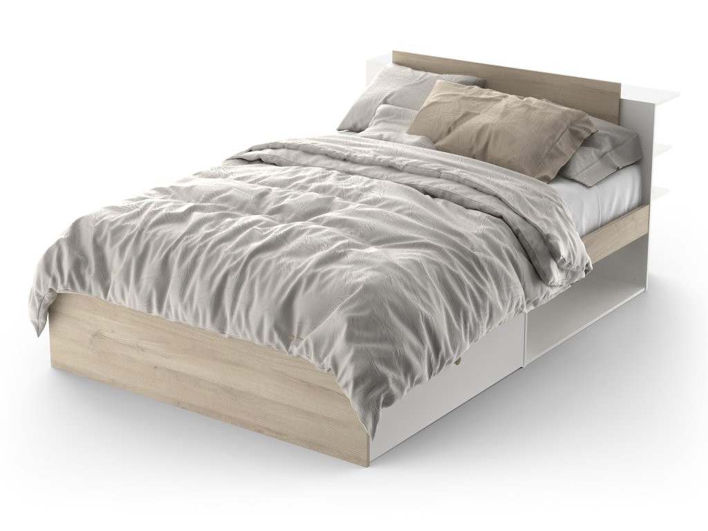 Posteľ Teya v kombinácii bielej farby a dekoru duba je moderným a zároveň praktickým riešením do menších spální, študentských alebo hosťovských izieb. Elegantné spojenie svetlej bielej a prírodného odtieňa dreva pôsobí nadčasovo a jednoducho sa kombinuje s iným nábytkom.