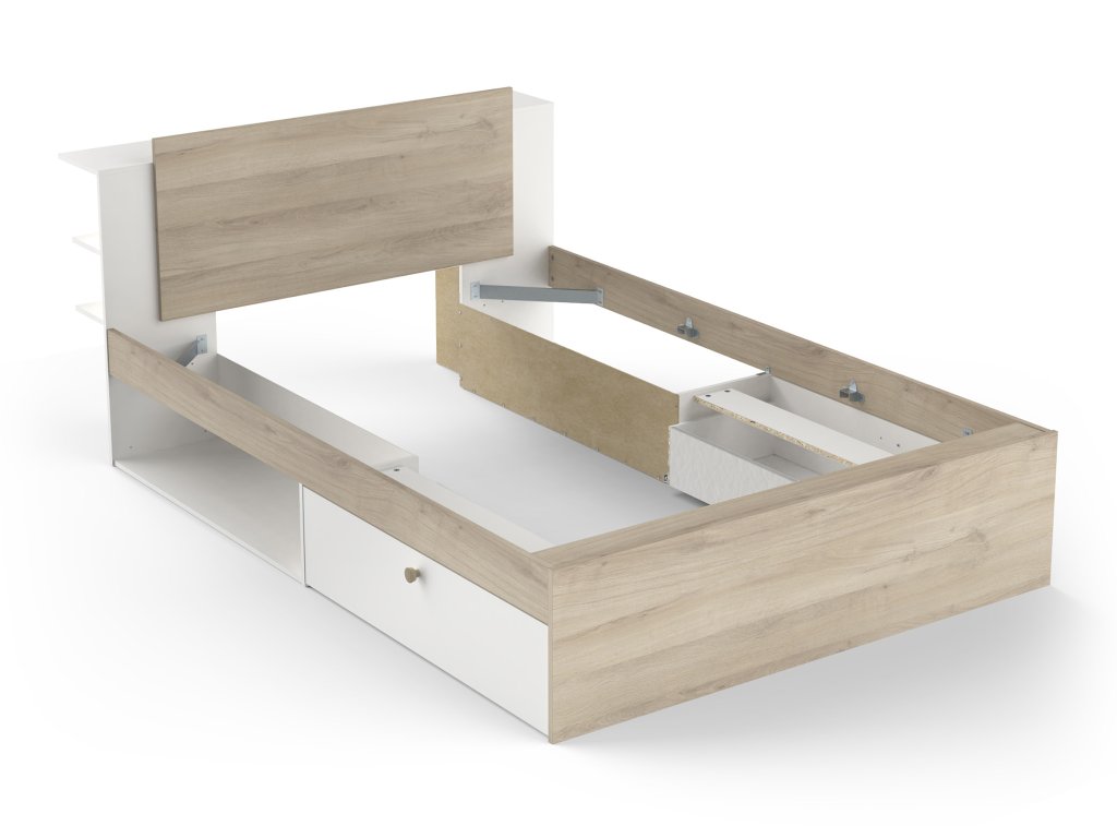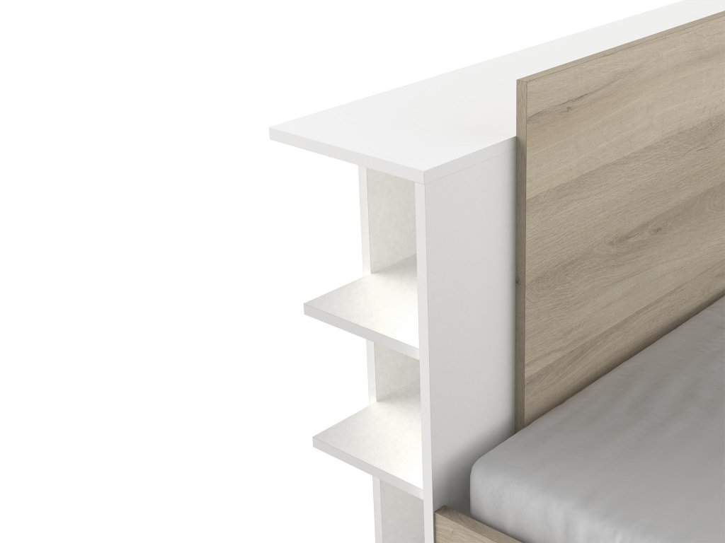 Posteľ ponúka komfortné lôžko s rozmerom 140 × 190/200 cm, ktoré je možné skrátiť pomocou vyberateľnej dosky na rozmer 140 × 190 cm. Výhodou je veľkorysý úložný priestor, ktorý sa ukrýva v dvoch priestranných zásuvkách po bokoch postele. Navyše je posteľ vybavená aj praktickým nadstavcom v záhlaví s otvorenými policami – ideálne na knihy, dekorácie či osobné predmety.