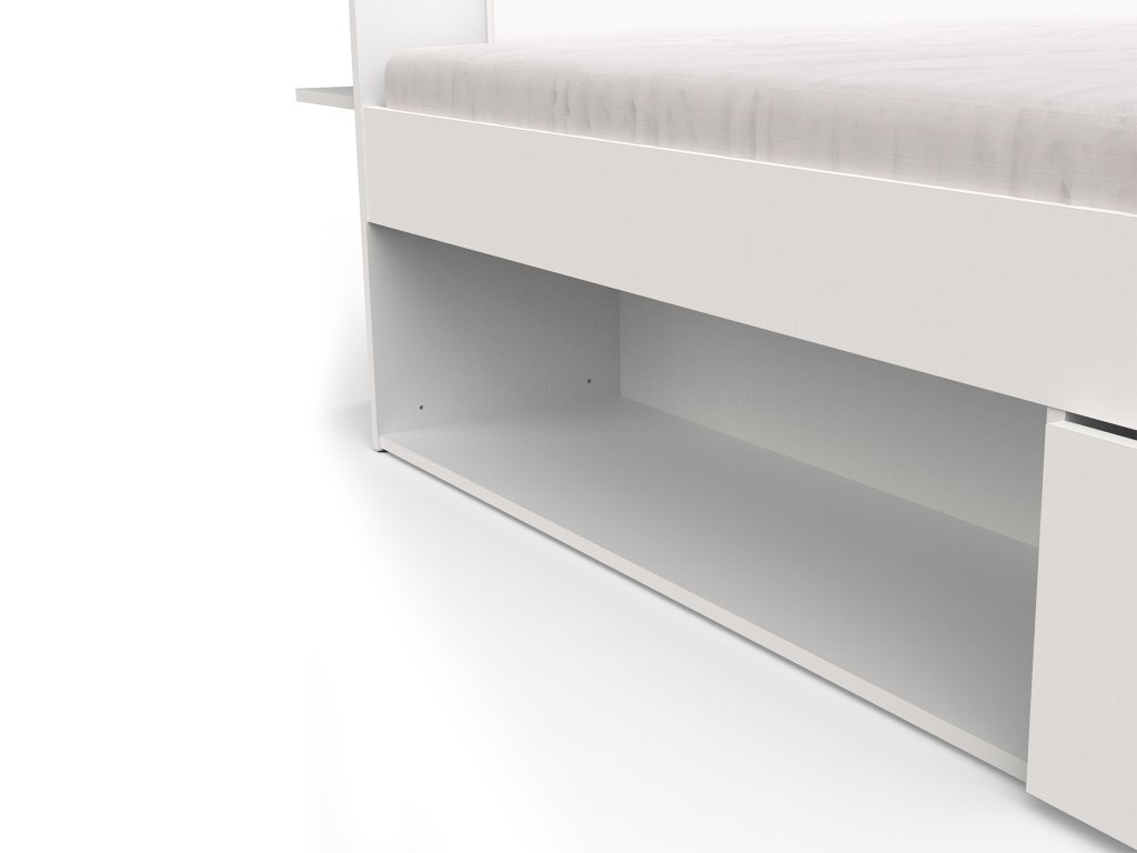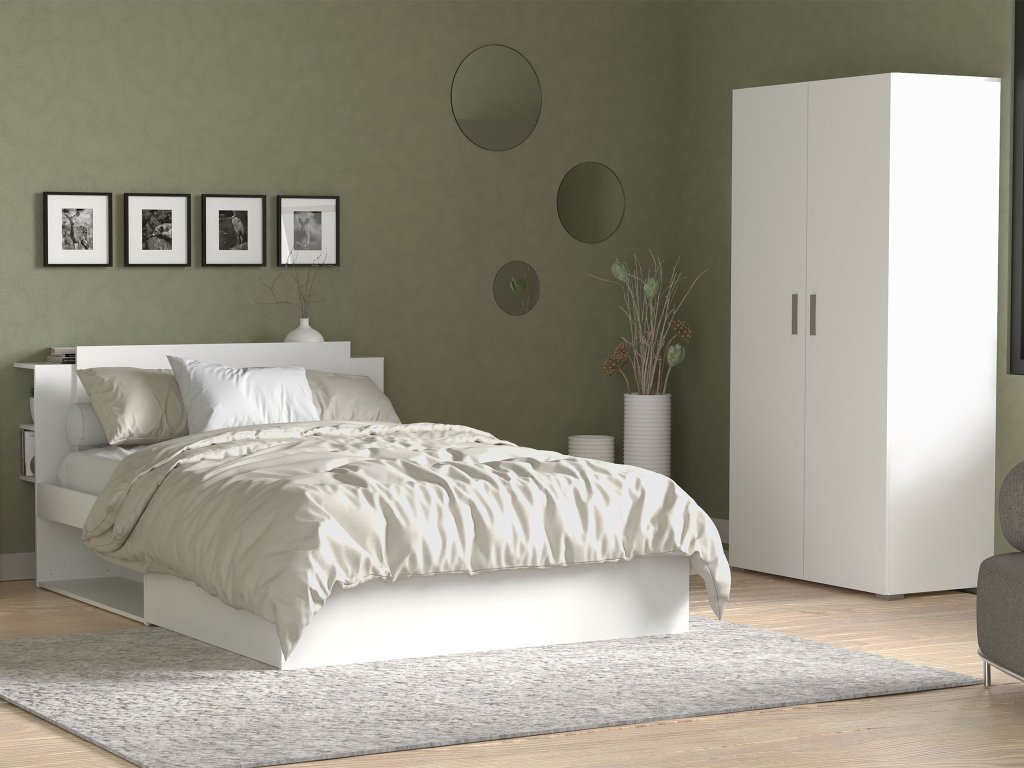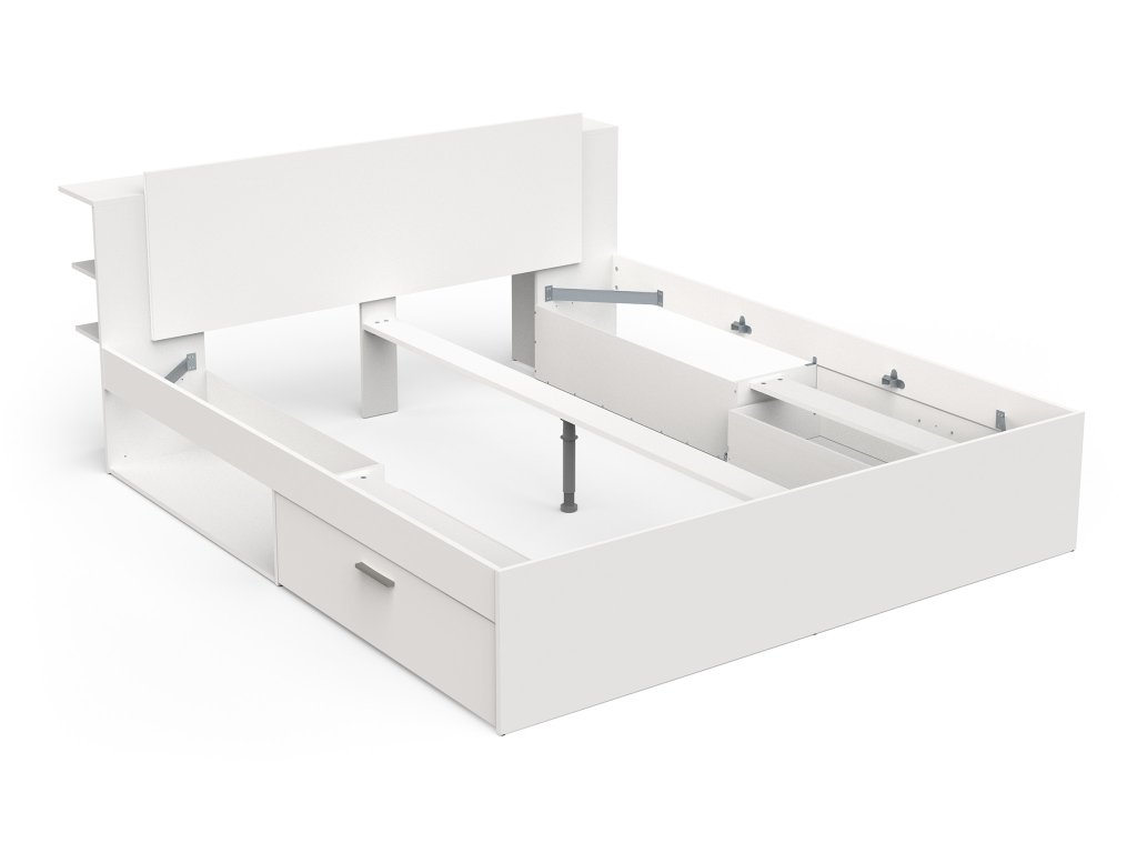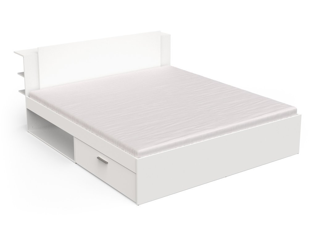 Posteľ je vybavená dvomi priestrannými zásuvkami po bokoch, ktoré slúžia ako praktický úložný priestor na lôžkoviny, sezónne oblečenie alebo ďalšie predmety. V záhlaví sa nachádza pevný nadstavec s policami, ktorý nahrádza nočný stolík a poskytuje miesto na knihy, dekorácie či lampu. Kvalitné spracovanie z odolnej laminátovej dosky s hrúbkou 18 mm zaručuje stabilitu a dlhú životnosť. Posteľ je vhodná pre dvoch a jej celková nosnosť je 200 kg.