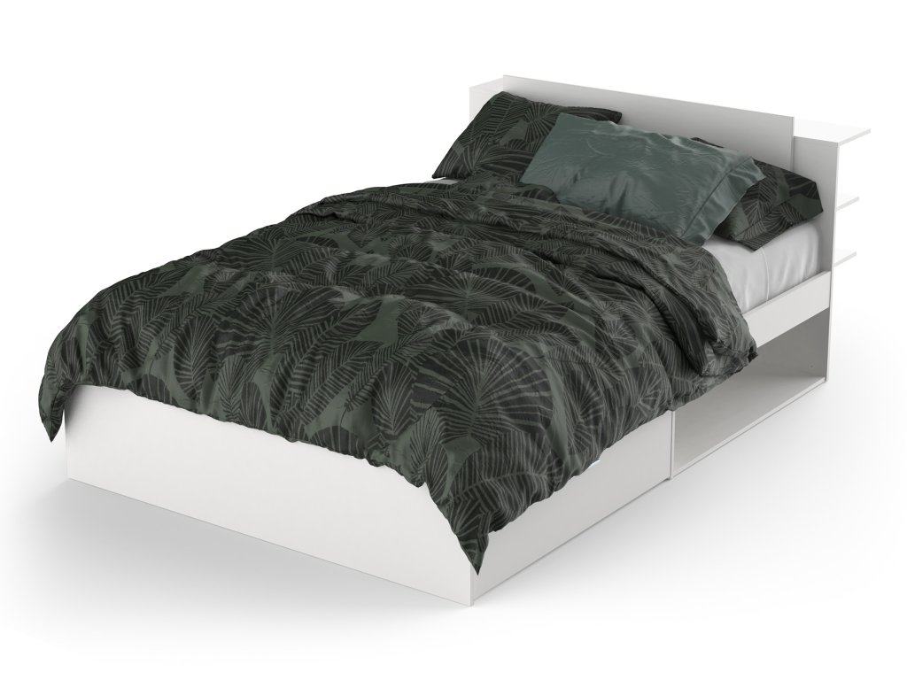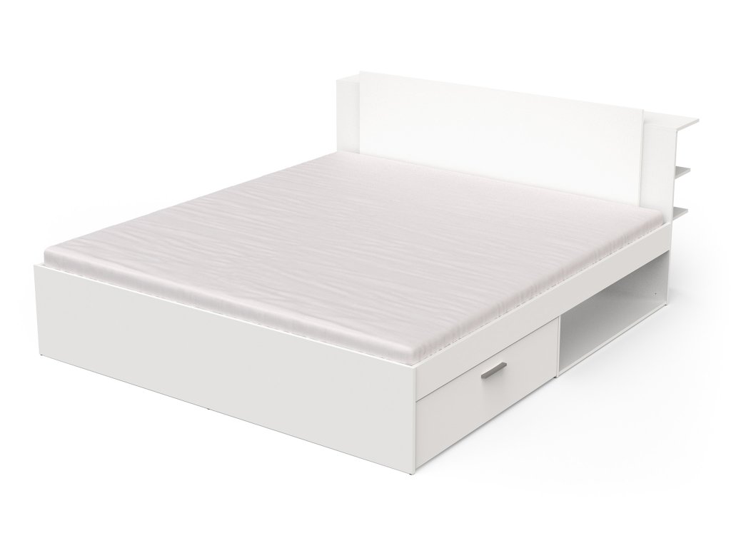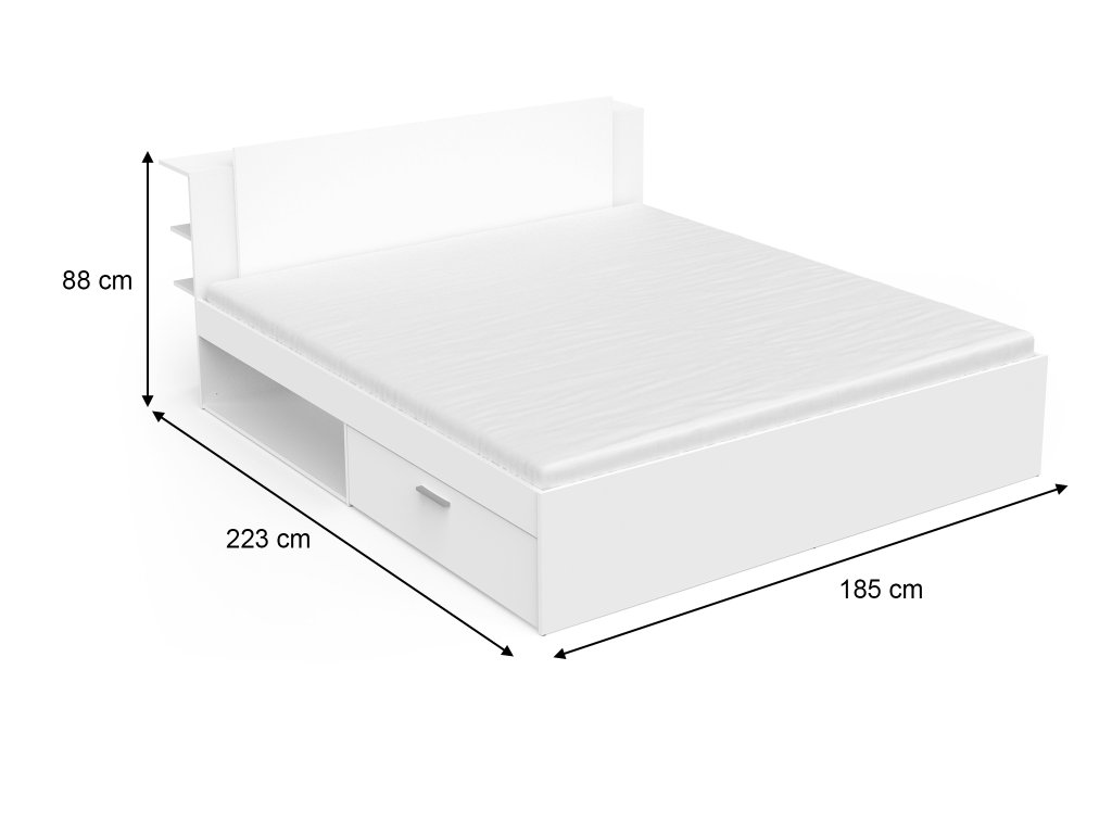 Manželská posteľ Teya v elegantnom bielom prevedení zaujme už na prvý pohľad čistými líniami a praktickým riešením úložného priestoru. Vďaka nadstavcu s otvorenými policami v čele postele a dvom výsuvným zásuvkám po bokoch získate množstvo miesta na uloženie lôžkovín, oblečenia či kníh – všetko tak budete mať vždy poruke, a pritom esteticky usporiadané.