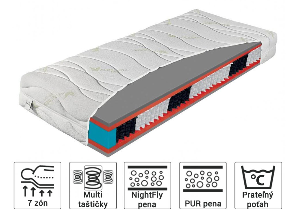 Materiálové zloženie: Multipocket pružiny 1000, Antibakteriálna PUR pena, NIGHTFLY pena, poťah
