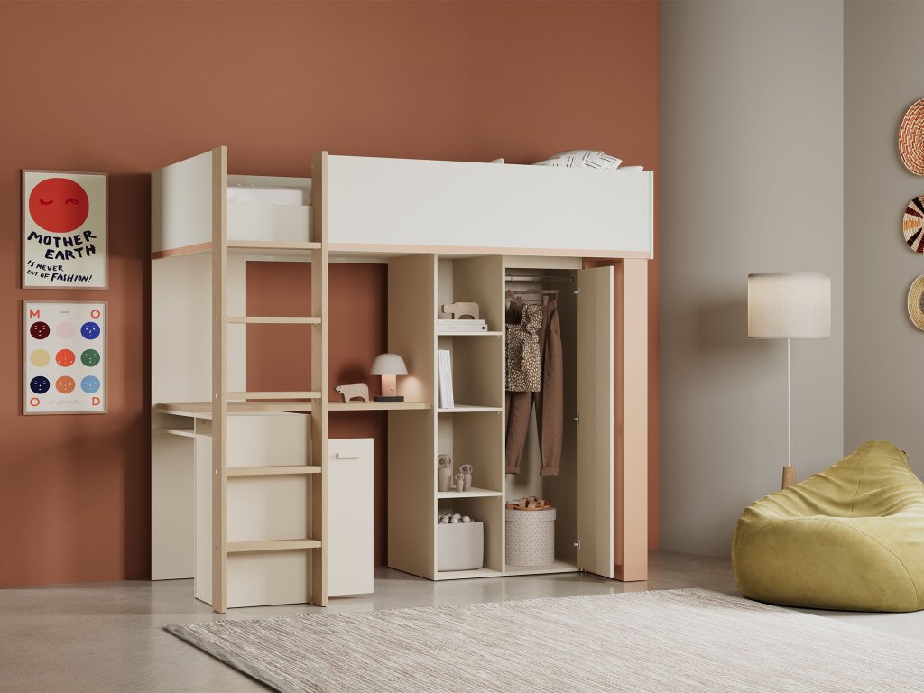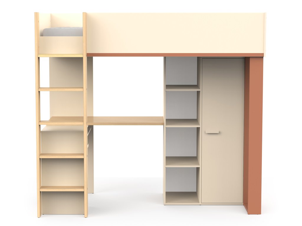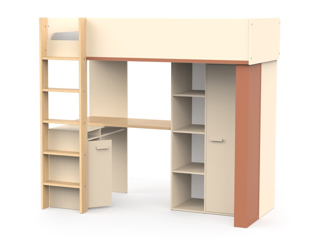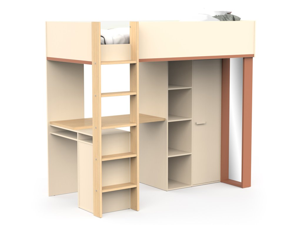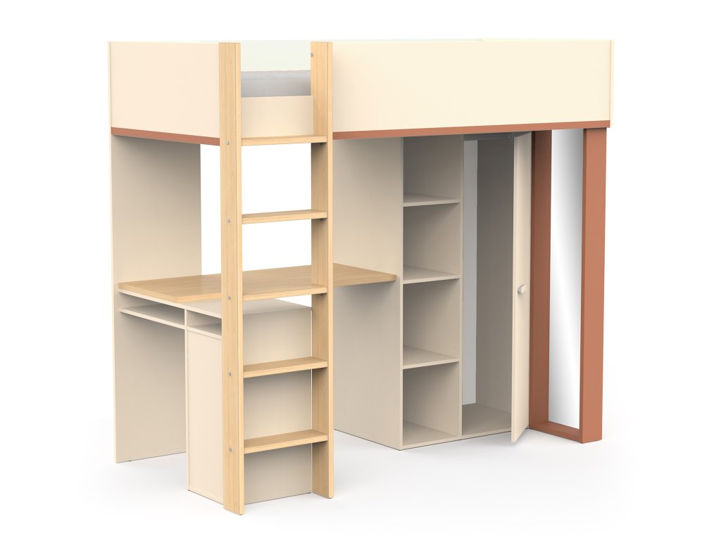 Konštrukcia je vyrobená z kvalitnej laminátovej dosky s hrúbkou až 28 mm, čo zaručuje stabilitu a dlhú životnosť. Všetky hrany sú upravené odolnou zažehlenou páskou. V podposteľovej časti sa nachádza priestranný písací stôl s úložnou policou a skrinkou, ale tiež šatníková skriňa, uzatvárateľné skrinky a otvorené police, ktoré zefektívňujú organizáciu a šetria priestor. Na bočnej strane vedľa skrine sa vo výklenku nachádza veľké zrkadlo. Dizajn vo farbe terracotta dodáva posteli teplý a hravý vzhľad, ideálny do moderných aj hravých interiérov.