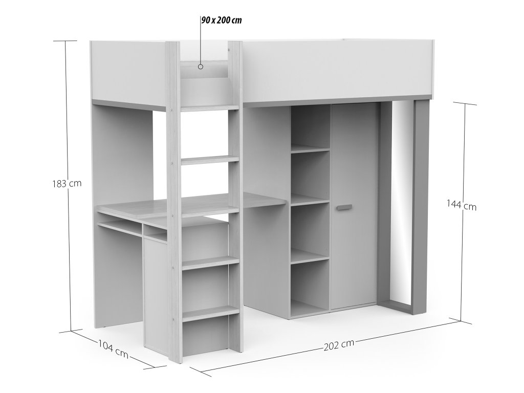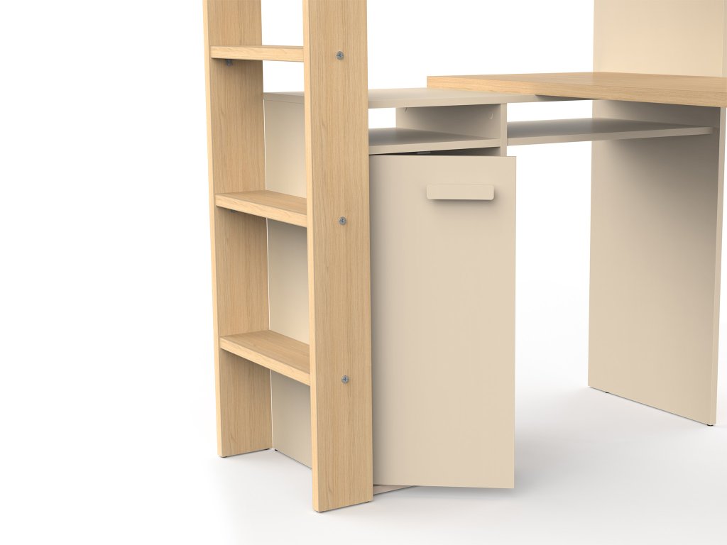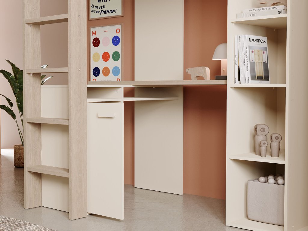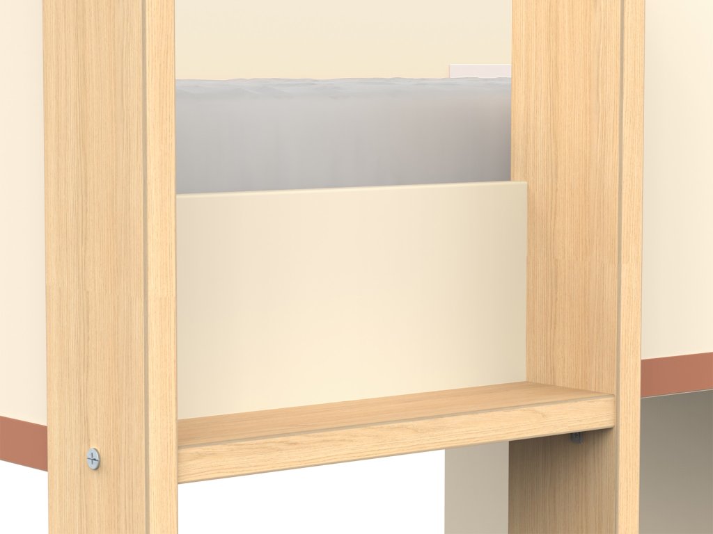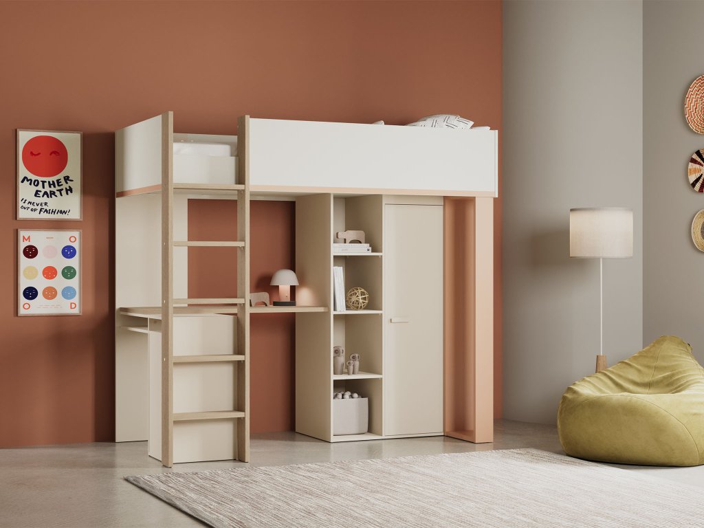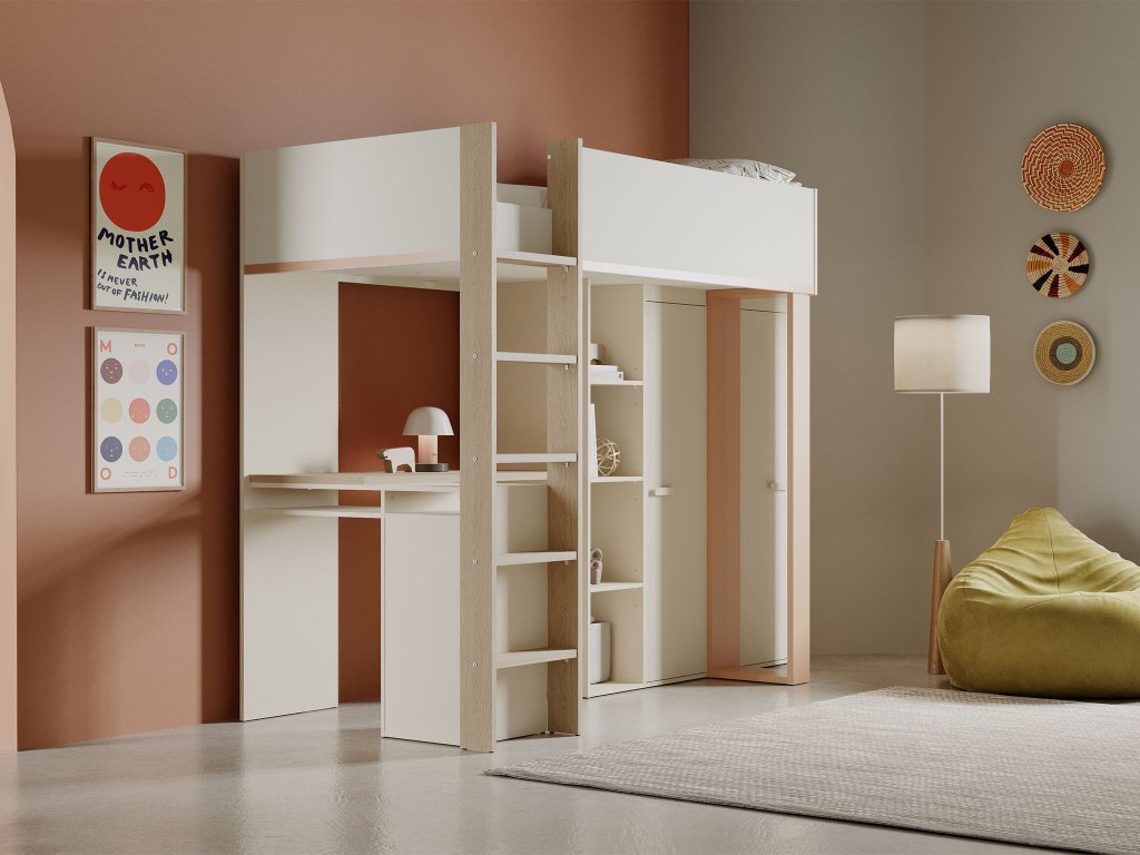 Konštrukcia je vyrobená z kvalitnej laminátovej dosky s hrúbkou až 28 mm, čo zaručuje stabilitu a dlhú životnosť. Všetky hrany sú upravené odolnou zažehlenou páskou. V podposteľovej časti sa nachádza priestranný písací stôl s úložnou policou a skrinkou, ale tiež šatníková skriňa, uzatvárateľné skrinky a otvorené police, ktoré zefektívňujú organizáciu a šetria priestor. Na bočnej strane vedľa skrine sa vo výklenku nachádza veľké zrkadlo. Dizajn vo farbe terracotta dodáva posteli teplý a hravý vzhľad, ideálny do moderných aj hravých interiérov.