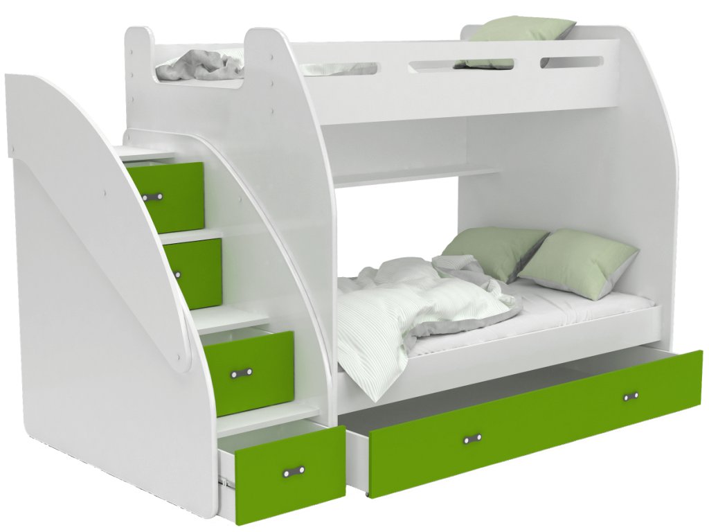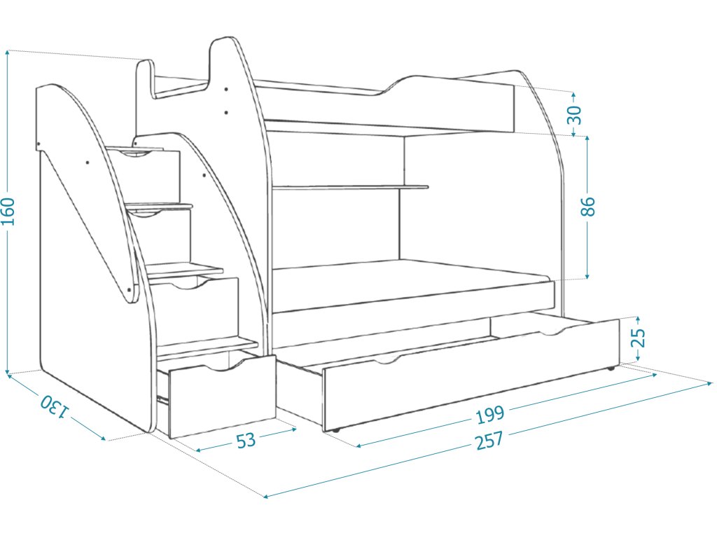 Zariaďujete izbu Vašim ratolestiam a nemáte dostatok voľného priestoru? Ak áno, ponúkame Vám riešenie v podobe tejto modernej multifunkčnej poschodovej postele MAX 3. Okrem dvoch lôžok na spanie Vám ponúka aj dostatok odkladacieho priestoru, vďaka schodom so zásuvkami, funkčnej police a úložného priestoru na kolieskach, ktoré umožňujú jednoduché zásúvanie a vysúvanie. Posteľ je vyrobená z kombinácie kvalitnej DTD a MDF v rôznych farebných prevedeniach. Rošty sú súčasťou postele. Na hornom lôžku je flexibilný lamelový rošt s 20 lamelami a na spodnom pevný latový rošt s 12 latami. Posteľ je univerzálna, a tak môže byť postavená ako pravá alebo ako ľavá.