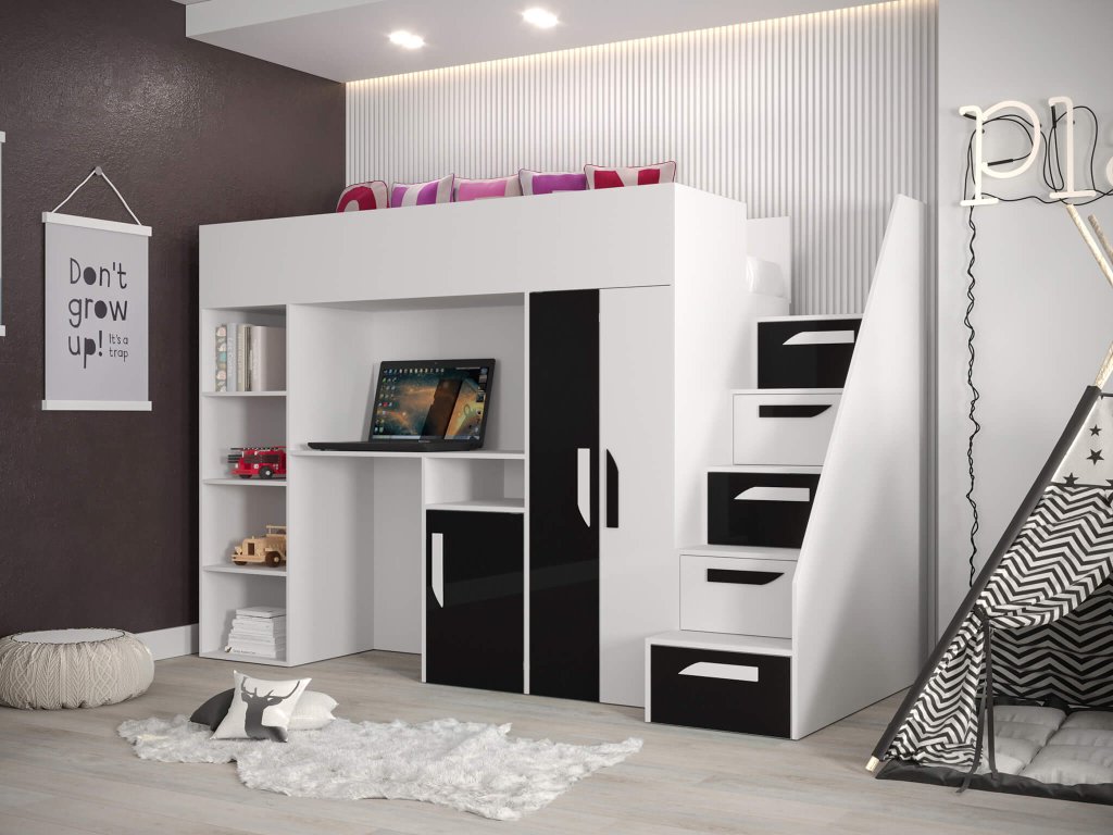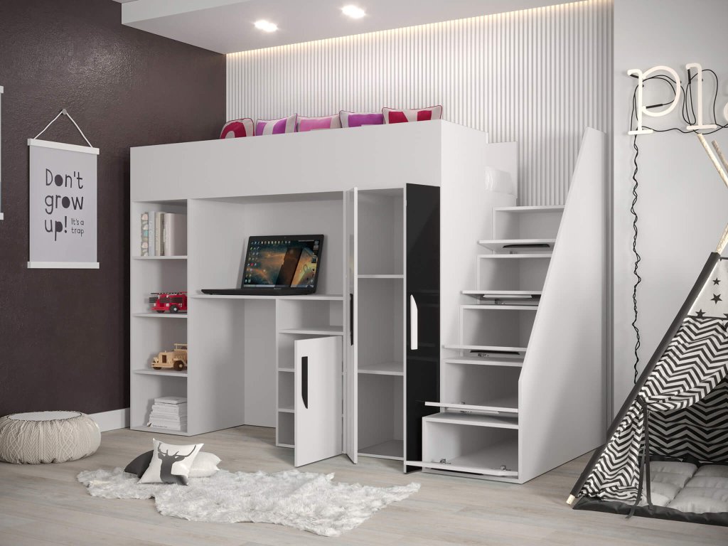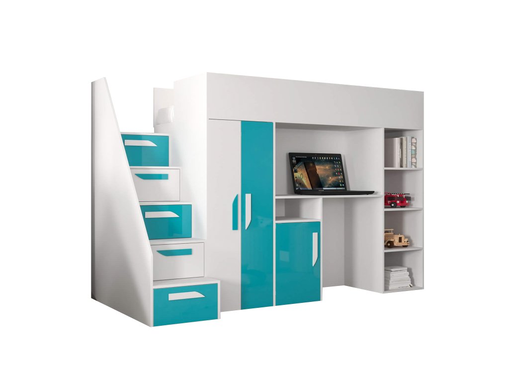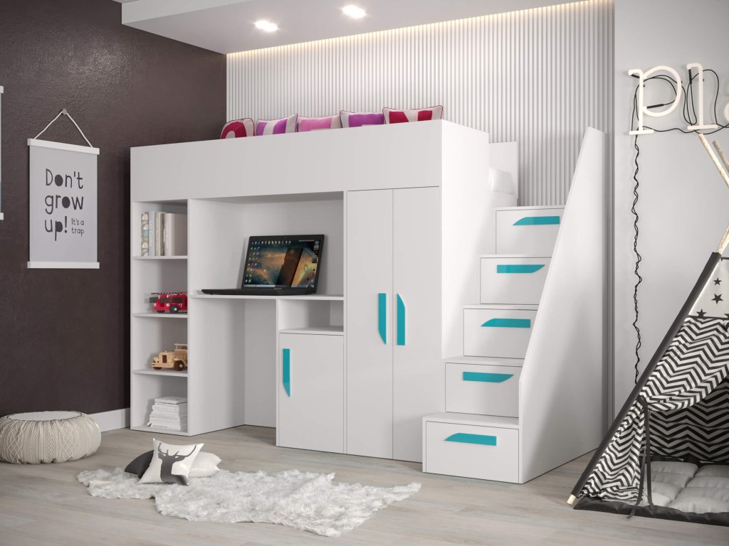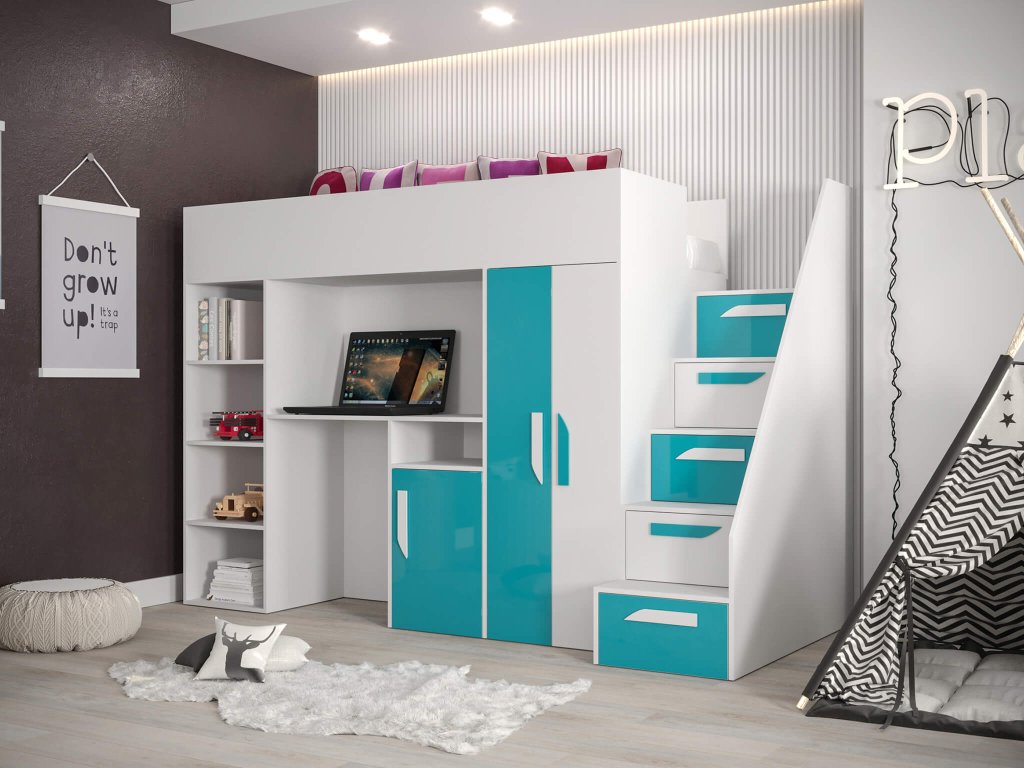 Aj v skutočne malých detských izbách dokážete pomocou tejto zostavy vyriešiť všetky zóny bývania pre svoje dieťa. Na ploche približne dvoch metrov štvorcových je miesto na spanie, skriňa na oblečenie, ďalšie poličky a skrinky na osobné veci, a dokonca aj miesto na písanie domácich úloh či prácu na počítači. S nosnosťou 60 kg bude posteľ spoľahlivo slúžiť aj mnohým teenagerom.