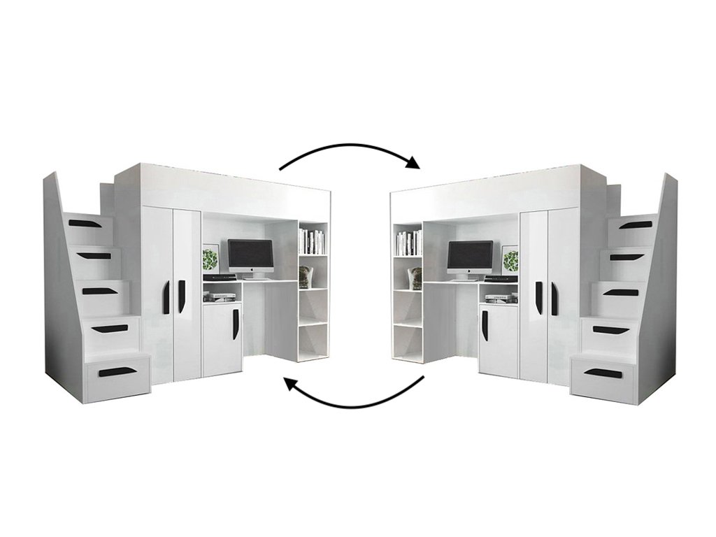 Zariaďujete detskú izbu a chceli by ste ušetriť čo najviac priestoru? Multifunkčná poschodová posteľ Party 14 bude tou správnou voľbou. Ušetrí kopu miesta v detskej izbe a vaše dieťa bude mať tak viac priestoru na hry a zábavu. Poschodová posteľ ponúka okrem miesta na spanie aj písací stôl, šatníkovú skriňu, police na odkladanie kníh a päť úložných priestorov, ktoré sa nachádzajú v schodíkoch. V šatníkovej skrini sa nachádzajú tri a v písacom stolíku dve police. Telo postele je vyrobené z matnej laminovanej dosky o hrúbke 16 mm a čelo z leskej DTD. Okraje sú starostlivo upravené s 0,5 mm PVC dýhou. Posteľ je univerzálna, a tak môže byť postavená ako pravá alebo ako ľavá.