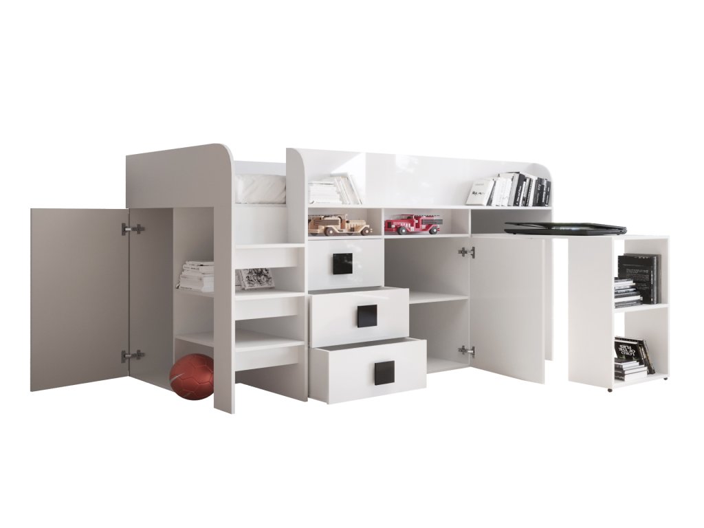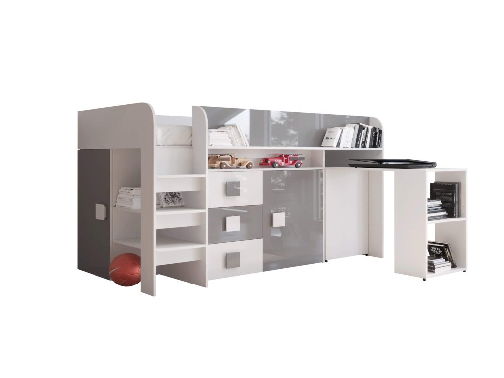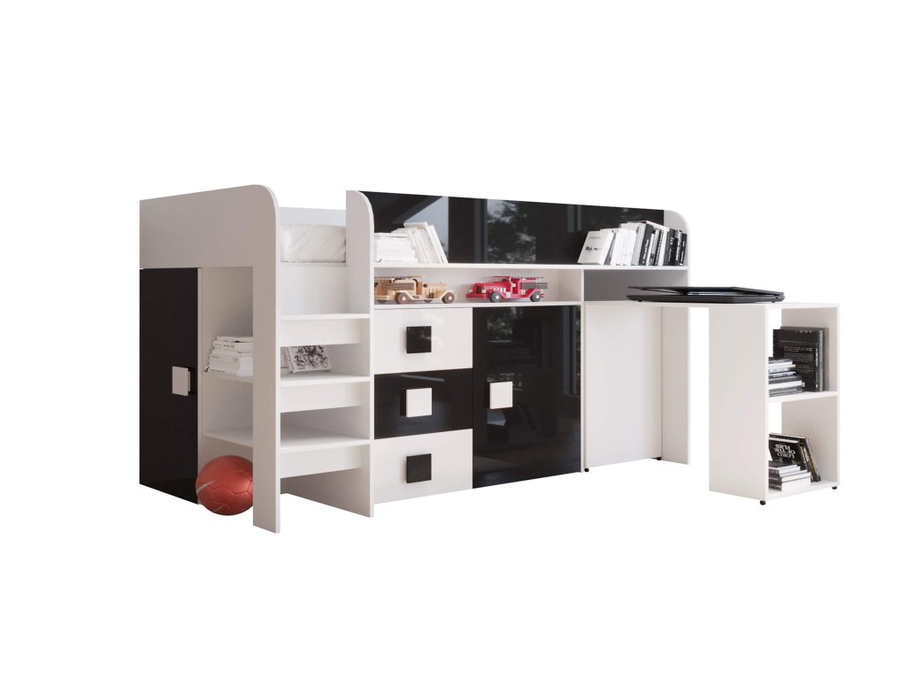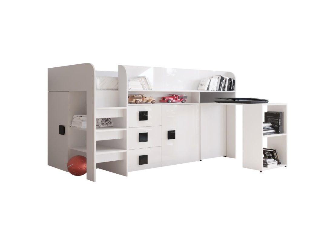 Multifunkčná detská posteľ Toledo 1 je tvorená písacím stolom na kolieskach, množstvom odkladacieho priestoru a zábranou po celom obvode lôžka. Tá chráni dieťa pred vypadnutím z postele počas spánku. Skrinka umiestnená z boku postele disponuje závesnou vysúvacou tyčou, na ktorú môžete zavesiť menšie kusy oblečenia. Posteľ je vyrobená z laminovanej nábytkovej dosky o hrúbke 16 mm, čelá postele sú vo vysokom lesku. Posteľ je univerzálna a je možné ju namontovať na ľavú alebo pravú stranu.
