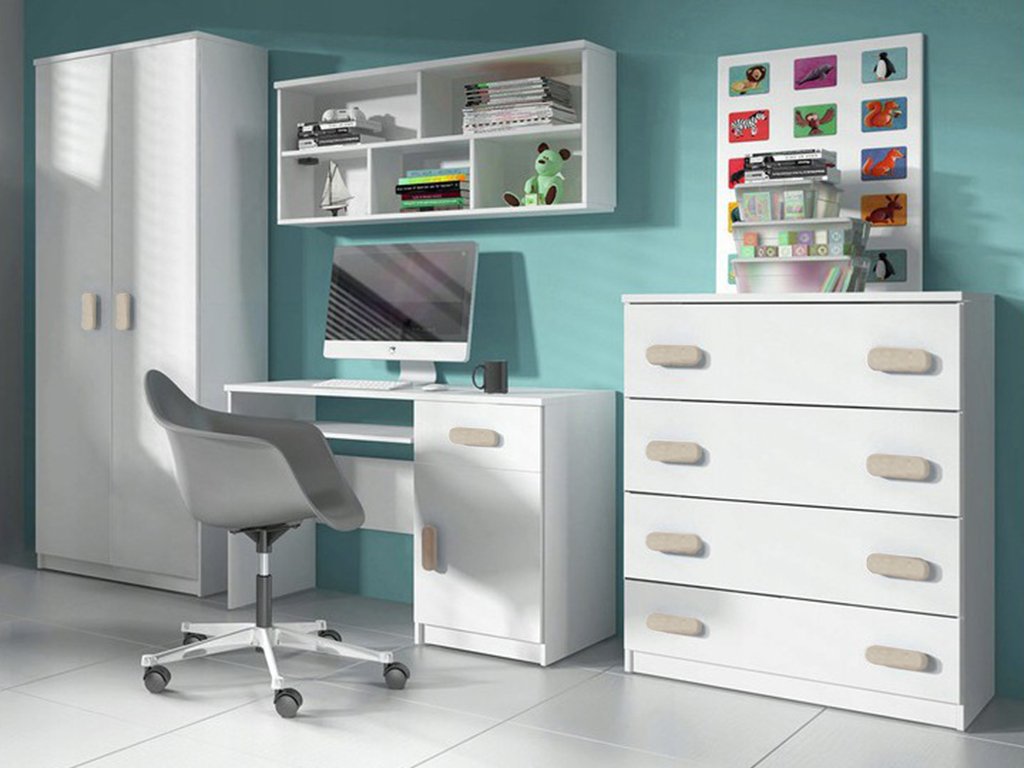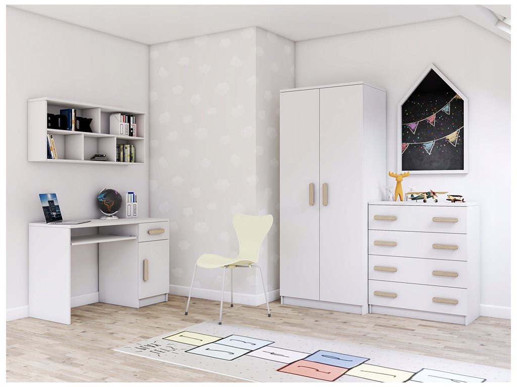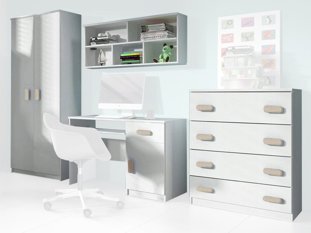 Nábytková stena SVEND sa skladá z: písacieho stola, komody, šatníkovej skrine a police.