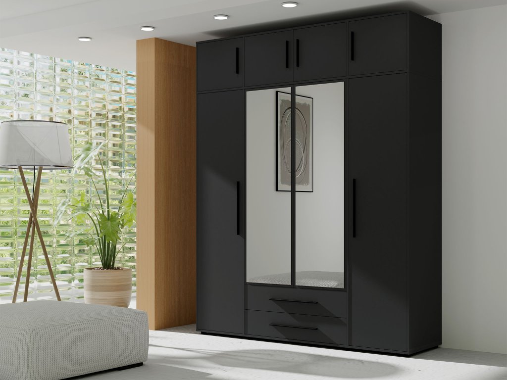 Čierna nadstavba Maxione je elegantným a funkčným doplnkom ku skrini Maxione so šírkou 197 cm, ktorý zväčší úložný priestor a dodá miestnosti moderný charakter. So štvordverovým prevedením ponúka dostatok priestoru na oblečenie, posteľnú bielizeň či sezónne doplnky, pričom udržiava interiér uprataný a štýlový.