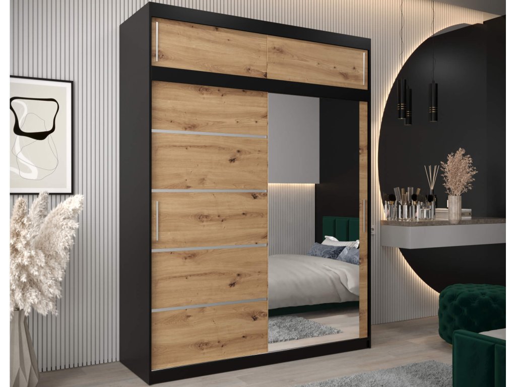 Využite voľný priestor pomocou praktického nadstavca na skriňu 180/200 vo farebnej kombinácii čierna a dub artisan. Nadstavec je vhodný k viacerým druhom skríň (napr. Alyxia, Alyxia II,...). Podobne ako skrine je vyrobený z vysoko kvalitnej laminátovej dosky (DTD), ktorá je odolná voči poškriabaniu, vlhkosti a vysokej teplote. Hrany sú upravené kvalitnou PVC dyhou. Použitý posúvný systém ,,BIMAK“ a hliníkové vodidlá Vám zaručia pohodlné otváranie a zatváranie dverí. Nadstavec je tvorený dvoma priestrannými skrinkami.