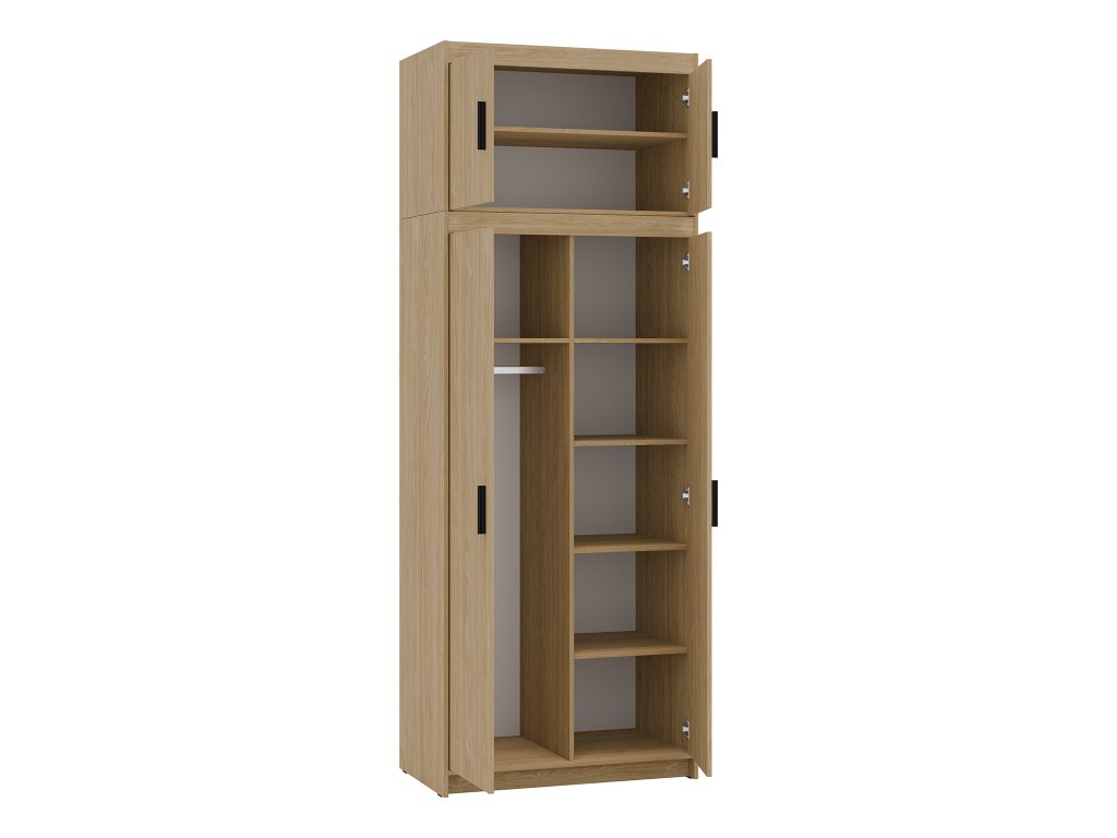 Každý centimeter priestoru sa počíta - nadstavec na skriňu Elenas 2D v dekore dub olejovaný je ideálnym riešením pre tých, ktorí chcú efektívne využiť každý kúsok miesta vo svojej spálni či predsieni. Elegantný dekor dreva vnesie do interiéru prírodný a nadčasový vzhľad, ktorý sa ľahko kombinuje s ostatným nábytkom a dotvára harmonickú atmosféru miestnosti. Nadstavec je vyrobený z odolnej laminovanej dosky s melamínovými hranami, čo zabezpečuje pevnú konštrukciu a dlhú životnosť. Praktické plastové úchytky umožňujú pohodlné otváranie a používanie, takže všetko uložené bude vždy po ruke a pripravené na každodenné používanie.