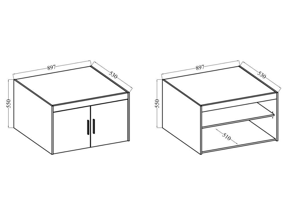 - Materiál: laminovaná doska (15mm), malamínové hrany, čierne plastové úchyty