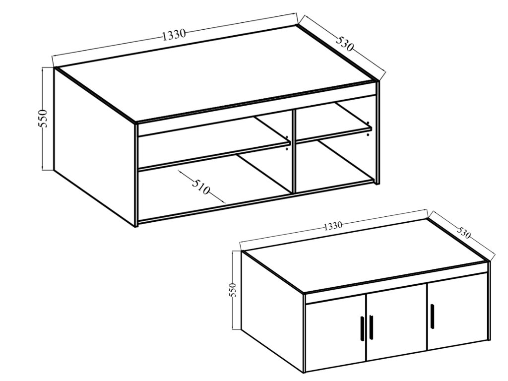 - Materiál: laminovaná doska (15mm), malamínové hrany, čierne plastové úchyty