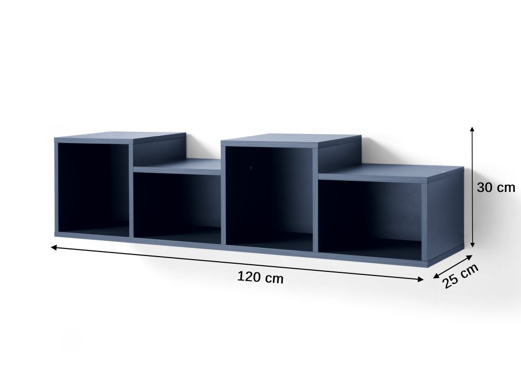 Nástenná polica SERGIO S10 v tmavomodrej farbe rozdelená na štyri časti v tvare kociek a obdĺžnikov sa hodí nad písací stôl v detskej izbe alebo pracovni. Poličky na stenu vám môžu vynahradiť zásuvky pod pracovným stolom. Využívať ju môžete na písacie potreby alebo literatúru, ktorú potrebujete mať blízko. Tmavomodré poličky sú vyrobené z kvalitnej laminovanej dosky s hrúbkou 16 mm. Hrany sú zakončené odolnou ABS dyhou.