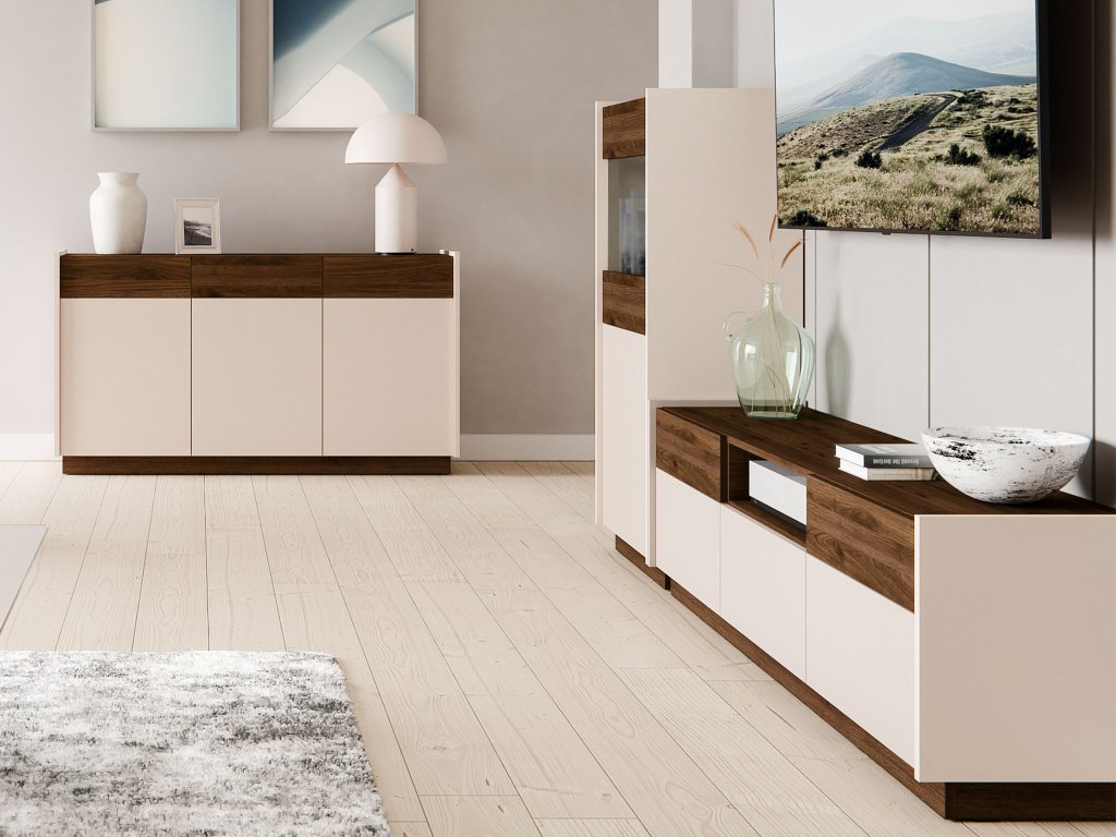 Kolekcia KOBE je stelesnením útulnosti a praktickosti. Celá kolekcia zahŕňa rôzne typy nábytku od TV stolíkov, komôd až po vitríny. Ponúka dostatok úložného priestoru a elegantný dizajn. Je vyrobená z odolnej laminovanej dosky a chránená ABS hranou. Kombinácia orechového a kašmírového dekoru vytvára harmonický vzhľad, ktorý spríjemní každý interiér. Charakteristickým prvkom kolekcie je systém otvárania push to open. Ten zaručuje pohodlné používanie, ľahký prístup k vašim veciam a čisté línie bez úchytiek. Kolekcia KOBE je ideálnou voľbou pre tých, ktorí hľadajú moderný nábytok s praktickým využitím.