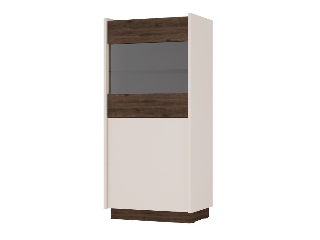 Nízka presklená vitrína KOBE 001 v príjemnom kašmírovo-orechovom dekore s jednými dvierkami. Vitrína do obývačky s okienkom z tvrdeného skla. Je ideálna na vystavenie vašich dekorácií, kníh alebo cenných pamiatok. Tento štýlový kúsok v modernom dizajne sa hodí do každého interiéru od obývacej izby po pracovňu.