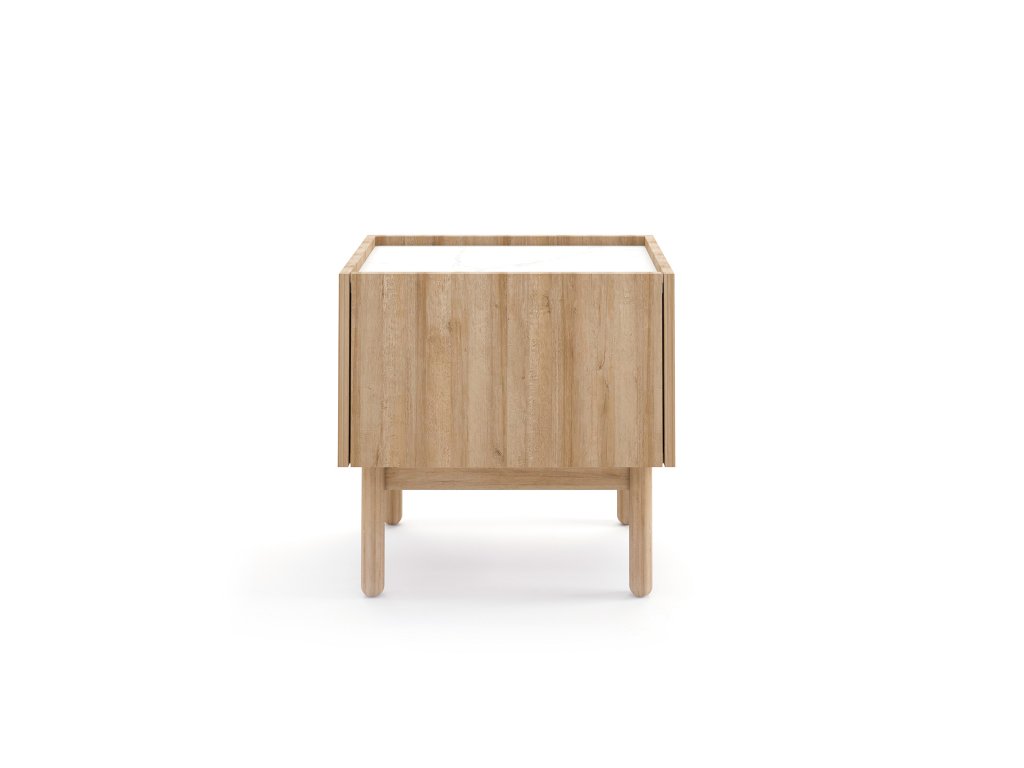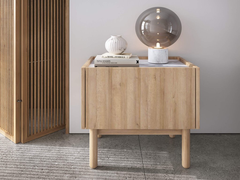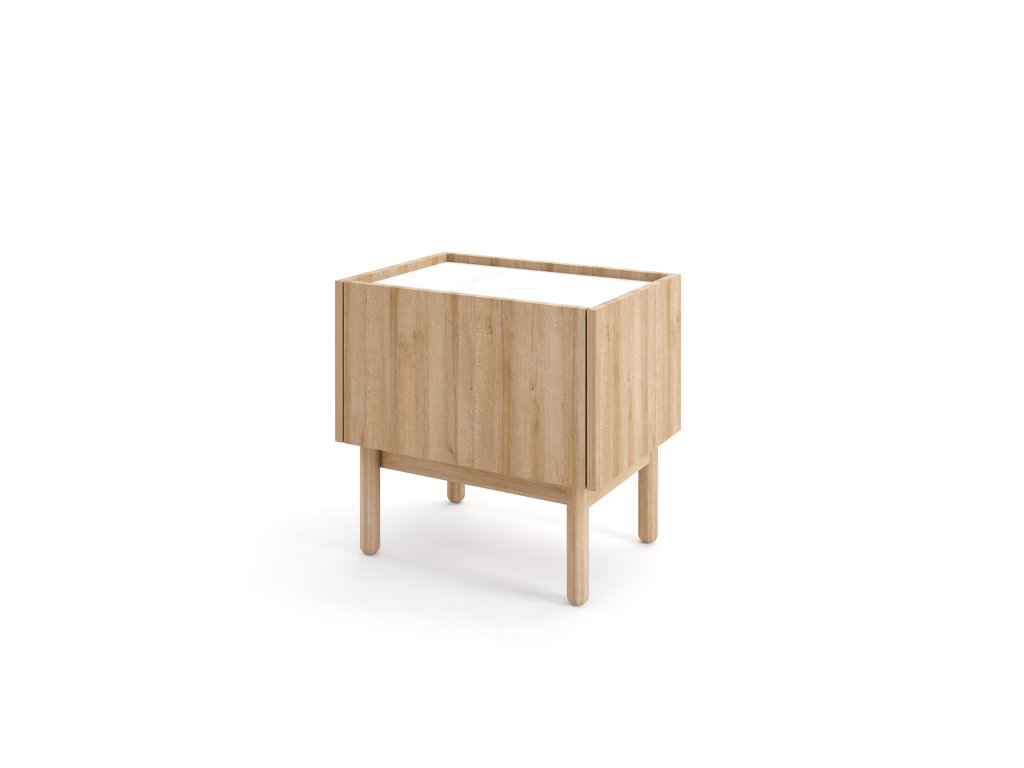 Praktický a štýlový nočný stolík BOHO S50 bude pôsobiť nerušene a útulne v každej spálni či detskej alebo študentskej izbe. Príjemnú farbu dub riviera v kombinácii s vrchnou doskou vo farebnom prevedení bieleho mramoru si hneď obľúbite. Vďaka jeho úložnému priestoru si každá vec nájde svoje miesto, pričom všetko budete mať poruke bez toho, že by ste museli opustiť pohodlie postele. Dvierka sú výklopné.