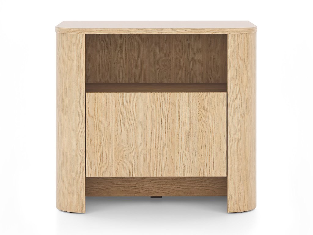 Nočný stolík Bori v prírodnom dekore dub vicenza prináša do spálne hrejivú a elegantnú atmosféru. Zásuvka poskytuje praktický úložný priestor na drobnosti, zatiaľ čo otvorená polička je ideálna na knihy, dekorácie alebo osobné doplnky, ktoré chcete mať vždy po ruke. Minimalistický dizajn s jemne zaoblenými hranami a systémom push-to-open bez úchytiek podčiarkuje moderný a čistý vzhľad, ktorý harmonicky dopĺňa ostatný nábytok kolekcie BORI.
