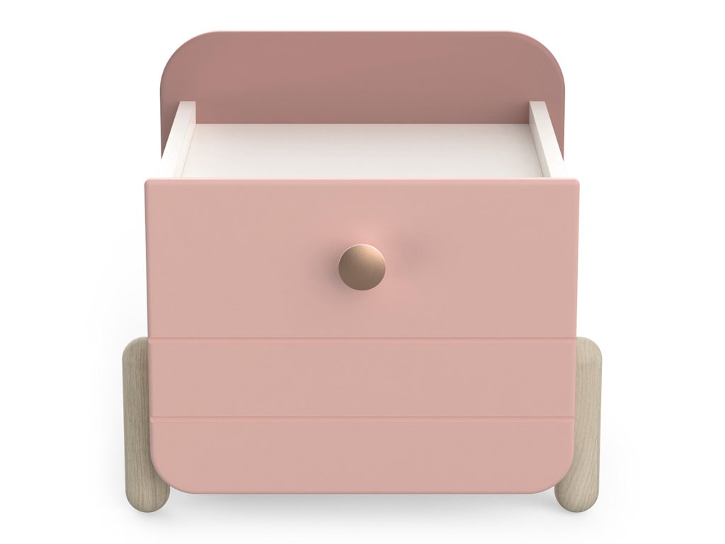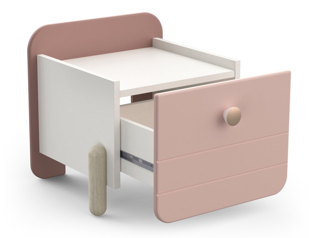 Nočný stolík Jade je ideálnym doplnkom do dievčenskej izby, ktorý v sebe spája jemnosť, funkčnosť a hravosť. Kombinácia matnej ružovej a bielej farby spolu s prírodným vzhľadom drevených nožičiek vytvára harmonický a upokojujúci dojem. Stolík ponúka hornú odkladaciu plochu na knihy, lampu či obľúbené hračky a otvorenú poličku na rýchly prístup k veciam.