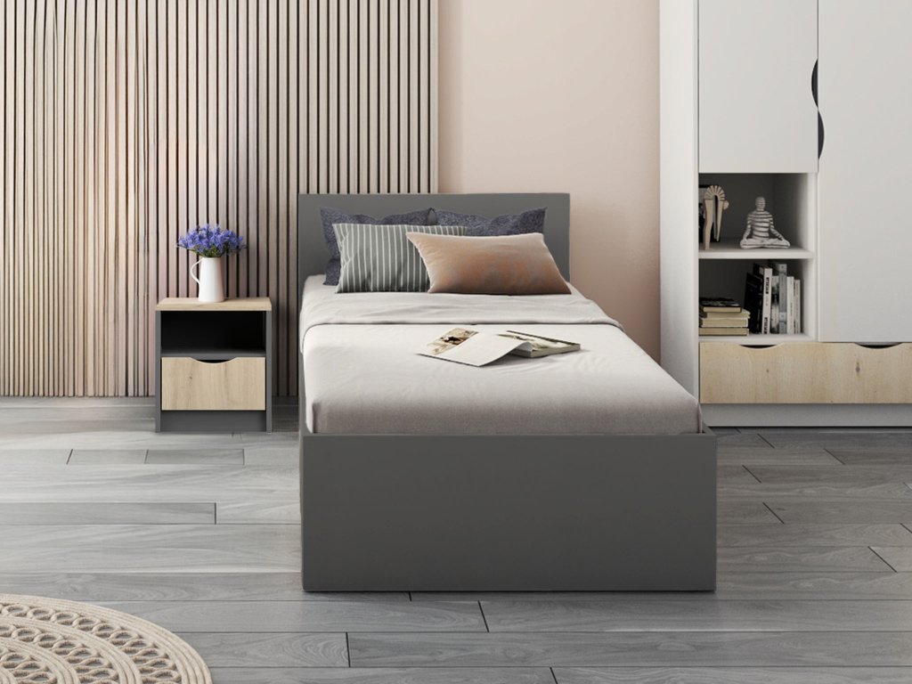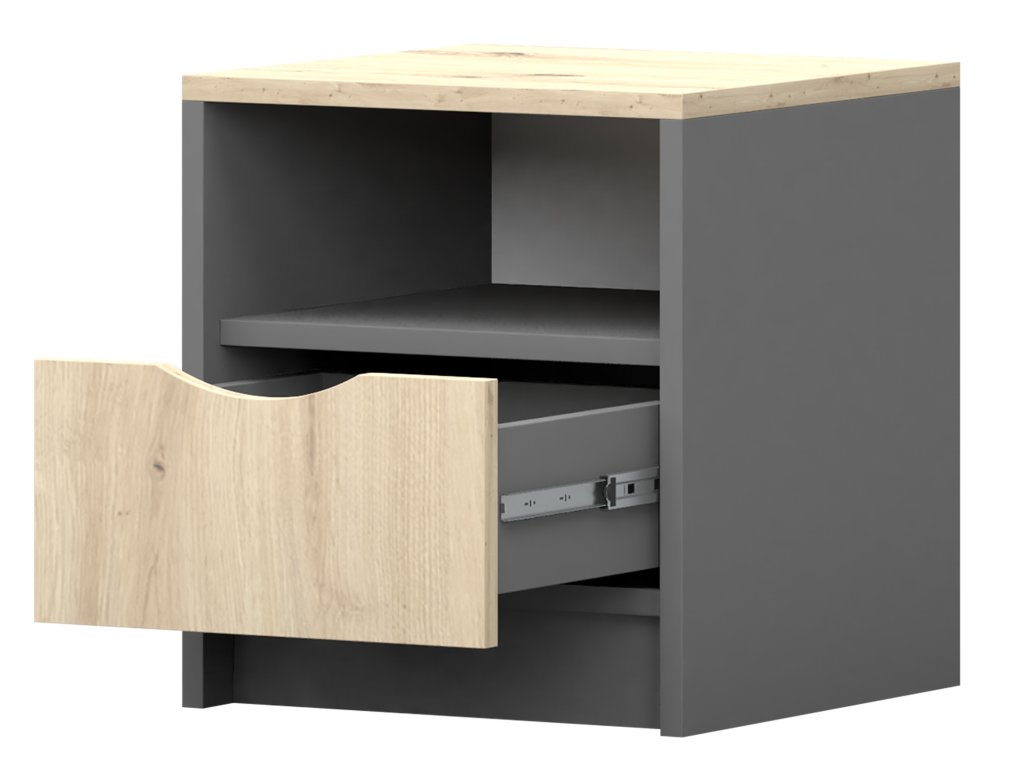 Doplňte si svoju spálňu alebo detskú izbu dizajnovým nočným stolíkom Joy v sivo-dubovom prevedení, ktorý spája moderný minimalizmus s maximálnou funkčnosťou. Jeho bezúchytkový systém zdôrazňuje čisté línie. Hlboká zásuvka a praktická otvorená polička ponúkajú dostatok miesta na všetky drobnosti, ktoré chcete mať vždy poruke či už je to obľubená kniha alebo okuliare.