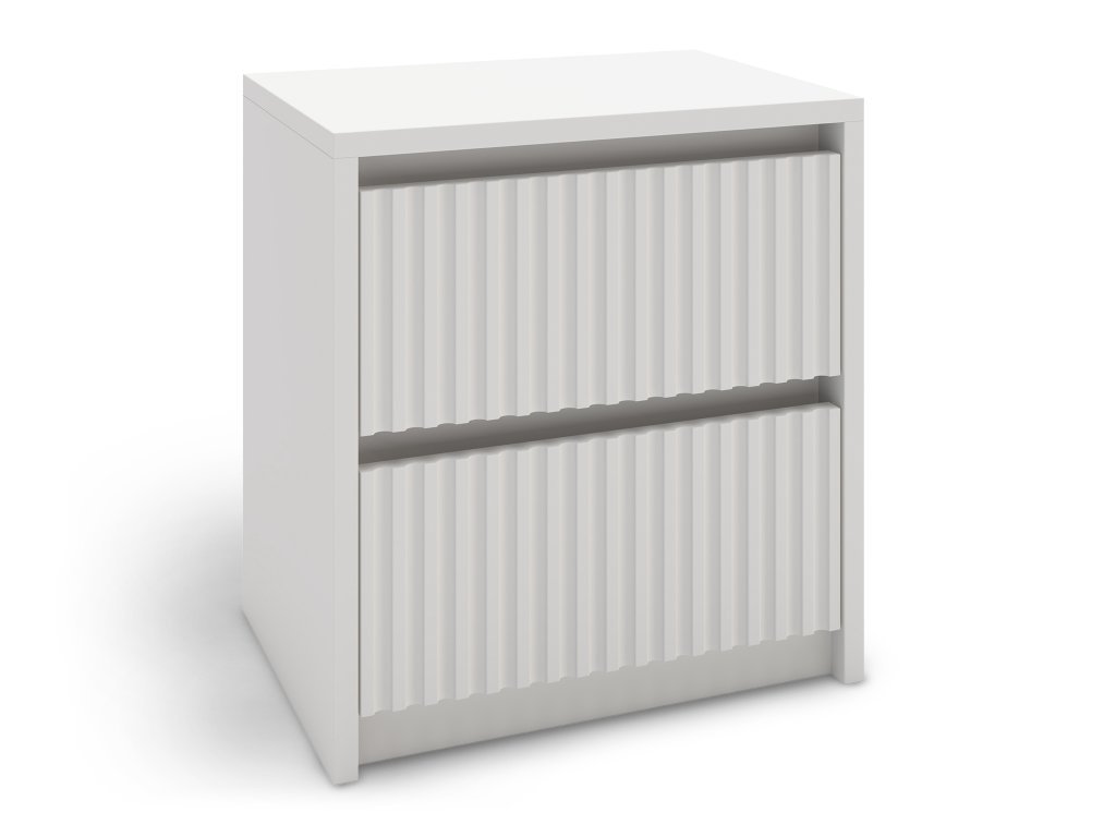 Nočný stolík Lumina 2 je vyrobený z kvalitných materiálov, ktoré zaručujú jeho dlhú životnosť a odolnosť voči každodennému používaniu. Povrchová úprava v matnej bielej je nielen príjemná na pohľad, ale aj mimoriadne nenáročná na údržbu. Najvýraznejším prvkom sú predné panely s vertikálnym frézovaním, ktoré nahrádzajú klasické úchytky a podčiarkujú čistý, nerušený vzhľad nábytku. Kvalitné šuflíky zabezpečujú tichý a plynulý chod, čo oceníte najmä v skorých ranných hodinách.