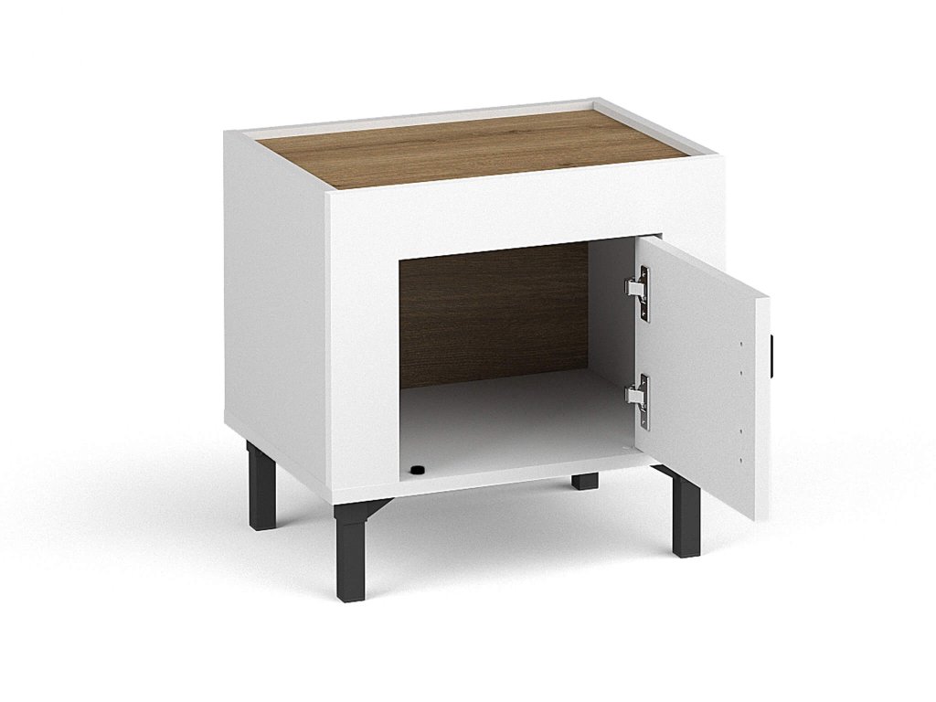 Nočný stolík Mossa má elegantný dizajn ktorý zaujme na prvý pohľad. Táto štýlová krabička v bielej farbe je vkusne doplnená o detail vo farbe dubu whisky na hornej doske a zadnom paneli, čím vytvára jemný kontrast a dodáva stolíku teplý, príjemný vzhľad. Biela farba v kombinácii s prírodným tónom dubu whisky prinesie štýlový prvok do vašej spálne.