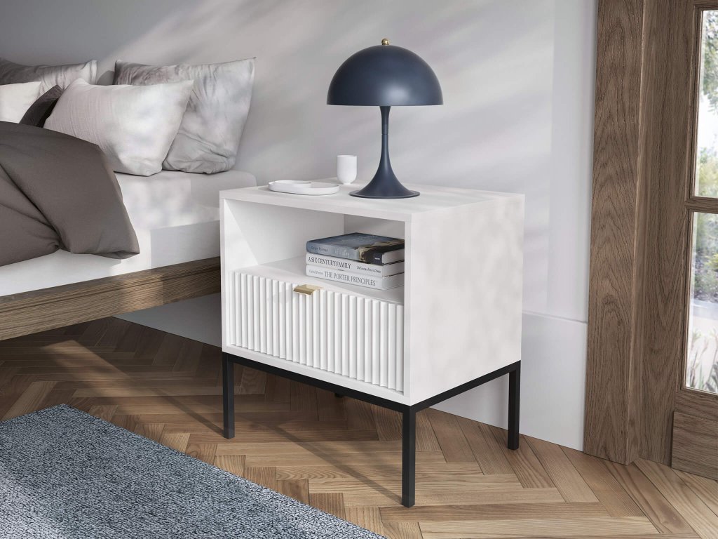 Praktický a moderný zároveň. Biely nočný stolík Nova S54 Vám pomôže rozumne a elegantne zariadiť Váš interiér. S jeho praktickým úložným priestorom môžete mať v posteli po ruke čokoľvek, čo potrebujete, a to bez toho, že by ste museli opustiť svoje pohodlie. Disponuje otvoreným úložným priestorom a zásuvkou.