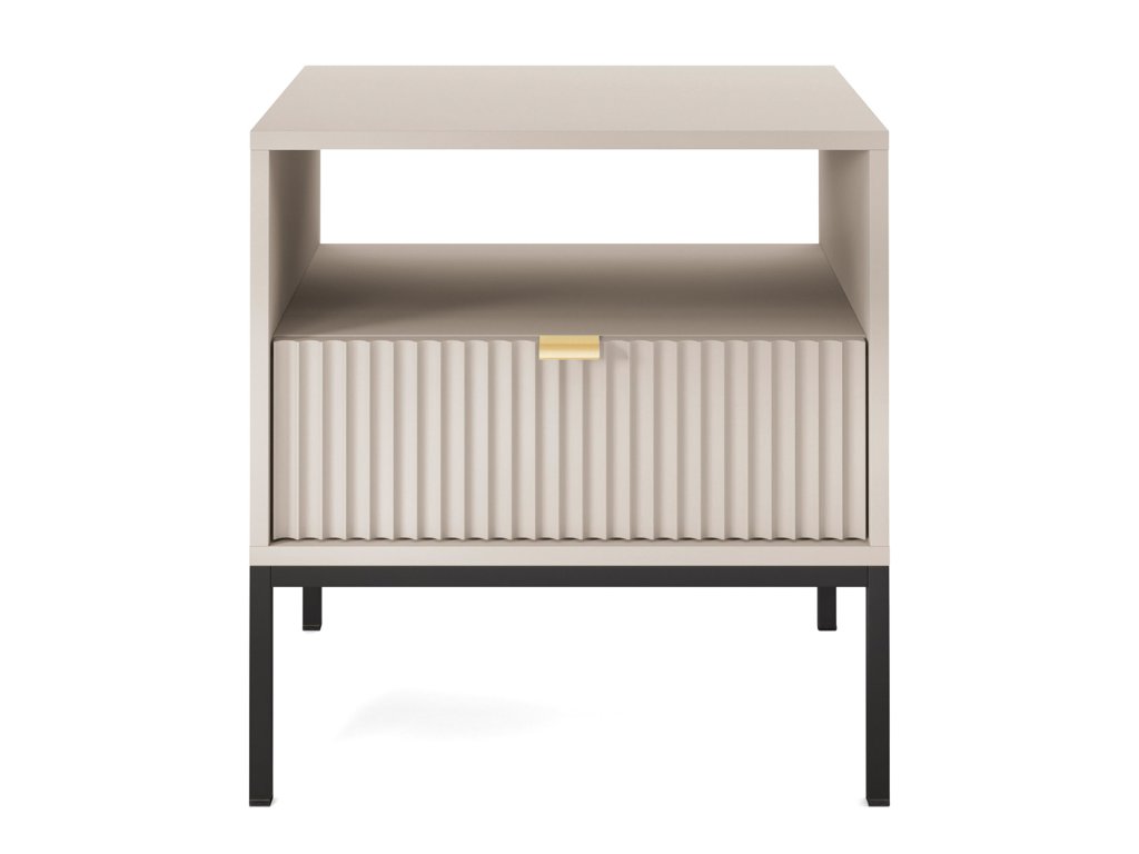 Nočný stolík Nova S54 v elegantnom kašmírovom odtieni prinesie do spálne jemnosť, štýl a praktickosť v jednom. Charakteristické drážkované čelo a subtílna zlatá úchytka vytvárajú luxusný prvok, ktorý okamžite upúta pozornosť. Konštrukcia na vysokých čiernych kovových nožičkách uľahčuje udržiavanie poriadku pod stolíkom. Kvalitný DTD korpus a pevná MDF predná časť sú zárukou dlhej životnosti a odolnosti, čo ocení každý, kto hľadá spojenie krásy a funkčnosti.