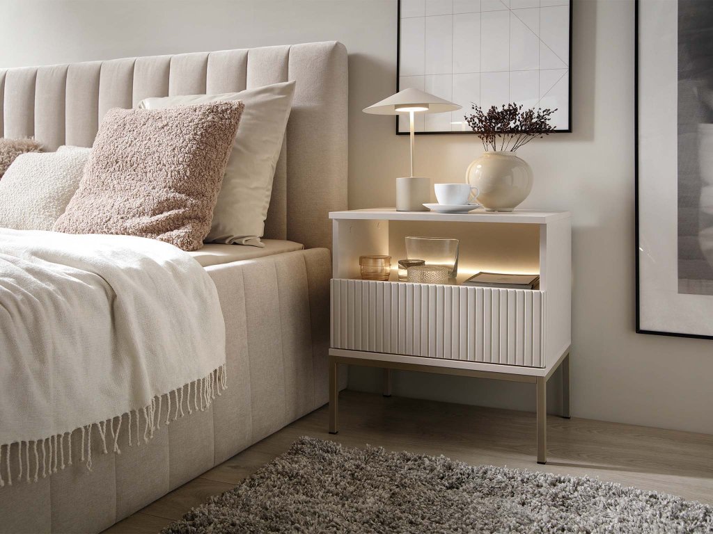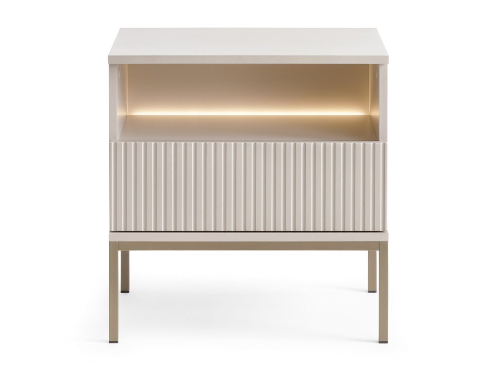 Nočný stolík s podsvietením SENTO predstavuje trendový kúsok pre modernú spálňu v luxusnom kašmírovom prevedení. Ak hľadáte nočný stolík s výrazným štýlom, Sento je ideálna voľba. Kombinuje zásuvku s dekoratívnym drážkovaním a otvorenú poličku. Tá je navyše vybavená jemným, integrovaným osvetlením, ktoré v spálni vytvára príjemnú, teplú atmosféru – nielen praktické, ale aj štýlové riešenie. Stolík stojí na vysokých kovových nožičkách a je vyrobený z kvalitnej laminovanej dosky s odolnými ABS hranami, čo zaručuje dlhú životnosť.
