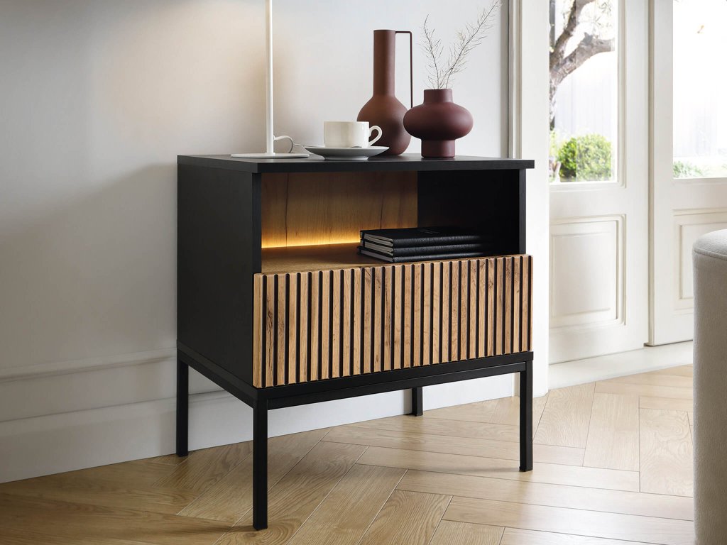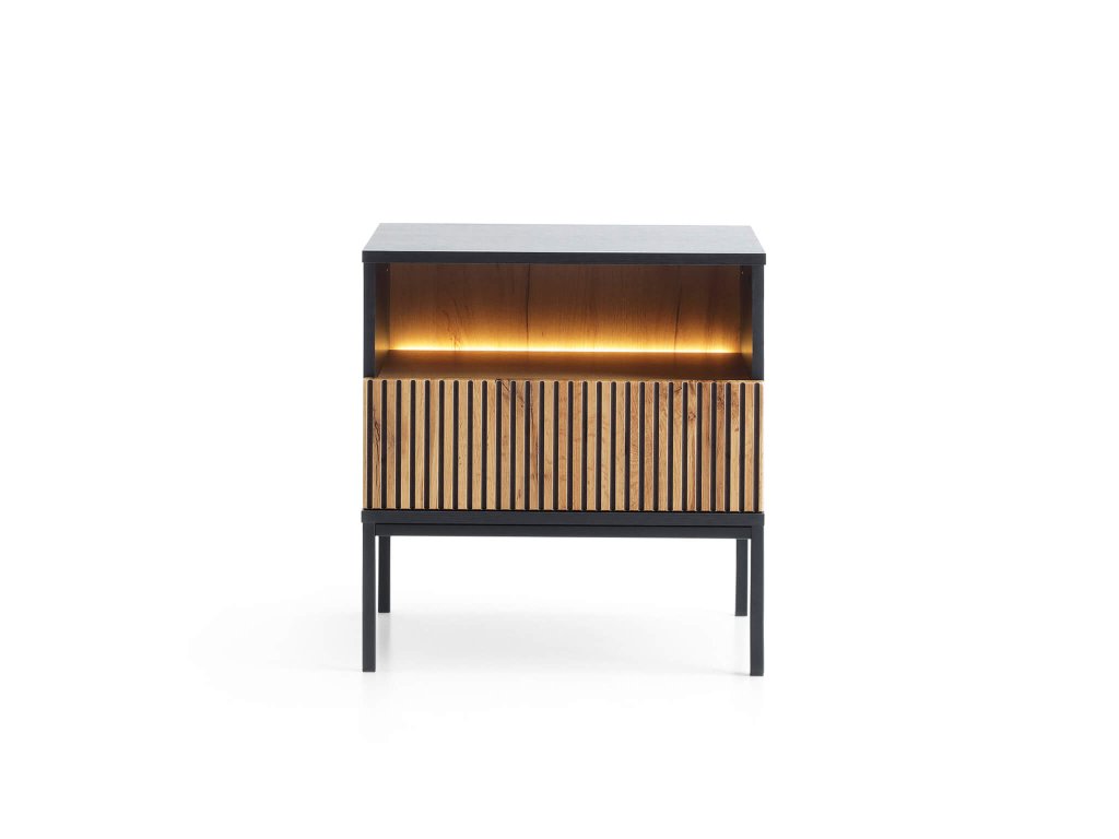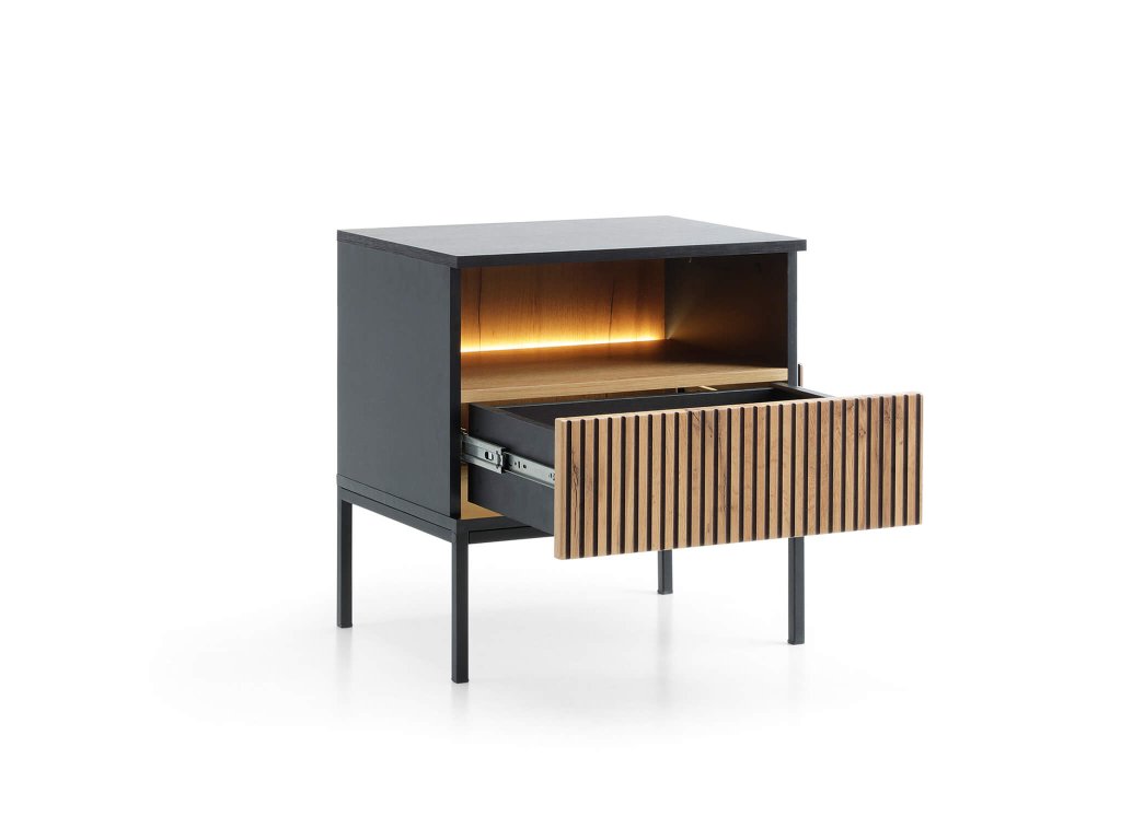Trendy kúsok do vašej spálne. Čierny nočný stolík Sento s poličkou a zásuvkou s drážkovaním v netradičnom odtieni dub wotan vynikne v modernej spálni s čalúnenou posteľou. Ak práve prerábate a hľadáte zaujímavý nočný stolík v tmavších farbách, zastavte sa pri tomto. Navyše nočný stolík Sento ma jemne osvetlenú poličku, čo nie je len praktické, ale aj štýlové. Najmä v spálni, kde je dobré uprednostniť teplé svetlo pred tým chladným. Nočný stolík je vyrobený z kvalitnej laminovanej dosky s odolnými ABS hranami a rovnako ako ďalší nábytok z kolekcie má vysoké kovové nožičky.