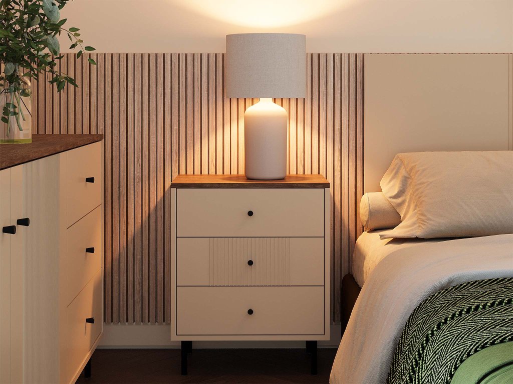 Nočný stolík TIRAMISU prináša do spálne jemnú eleganciu a praktickú funkčnosť v dokonale vyváženom dizajne. Kašmírový odtieň pôsobí pokojne a harmonicky, vďaka čomu vytvára príjemnú atmosféru ideálnu na oddych. Čisté línie a nadčasové prevedenie robia zo stolíka univerzálny doplnok do moderných aj klasickejšie ladených interiérov. Tri priestranné zásuvky poskytujú dostatok miesta na uloženie všetkého, čo chcete mať po ruke – od kníh a drobností až po osobné predmety. Bezúchytkový dizajn zvýrazňuje minimalistický charakter a dodáva stolíku elegantný vzhľad. TIRAMISU je štýlovým a funkčným spoločníkom pri posteli, ktorý spája estetiku s každodenným komfortom.