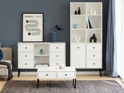 Obývaciu izbu Linea tvoria tri kúsky nábytku: komoda 6S , policový regál 1D3S a konferenčný stolík.
