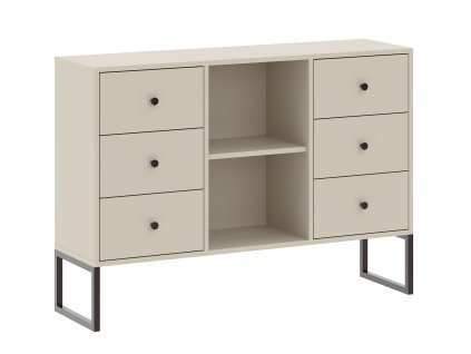 - Komoda Linea 6S: ponúka šesť priestranných zásuviek umiestnených po stranách, zatiaľ čo v strede nájdete praktickú policu. Rozmery (šxvxh): 114,9 x 82,5 x 33 cm