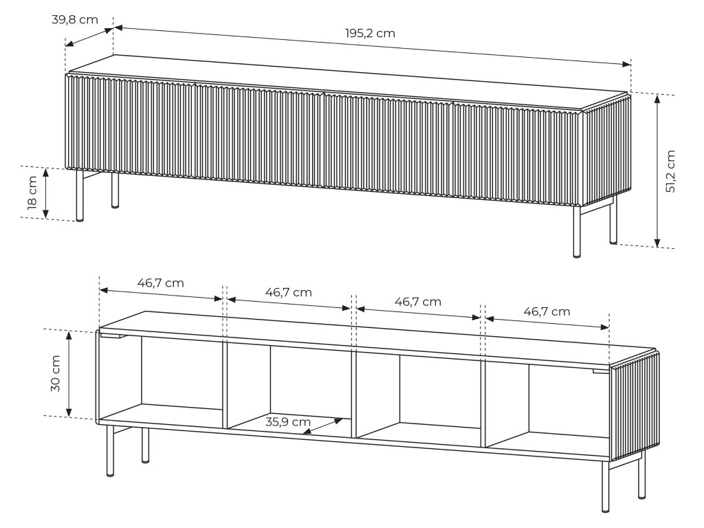 - TV stolík Muti E očarí vzhľadom a funkčným priestorom na uloženie elektroniky, káblov, či kníh. Rozmery (šxvxh): 195,2 x 51,2 x 39,8 cm