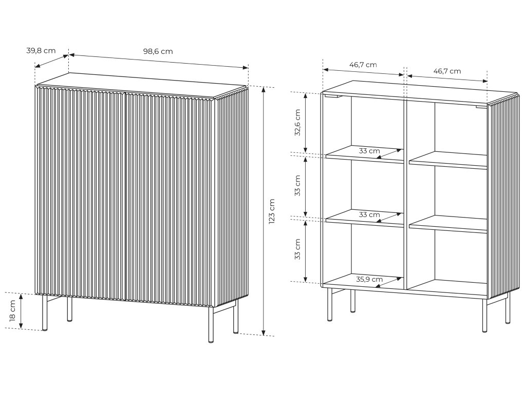 - Materiál: laminovaná doska o hrúbke 16 mm s 0,5 mm ABS hranami / MDF / kovové nohy