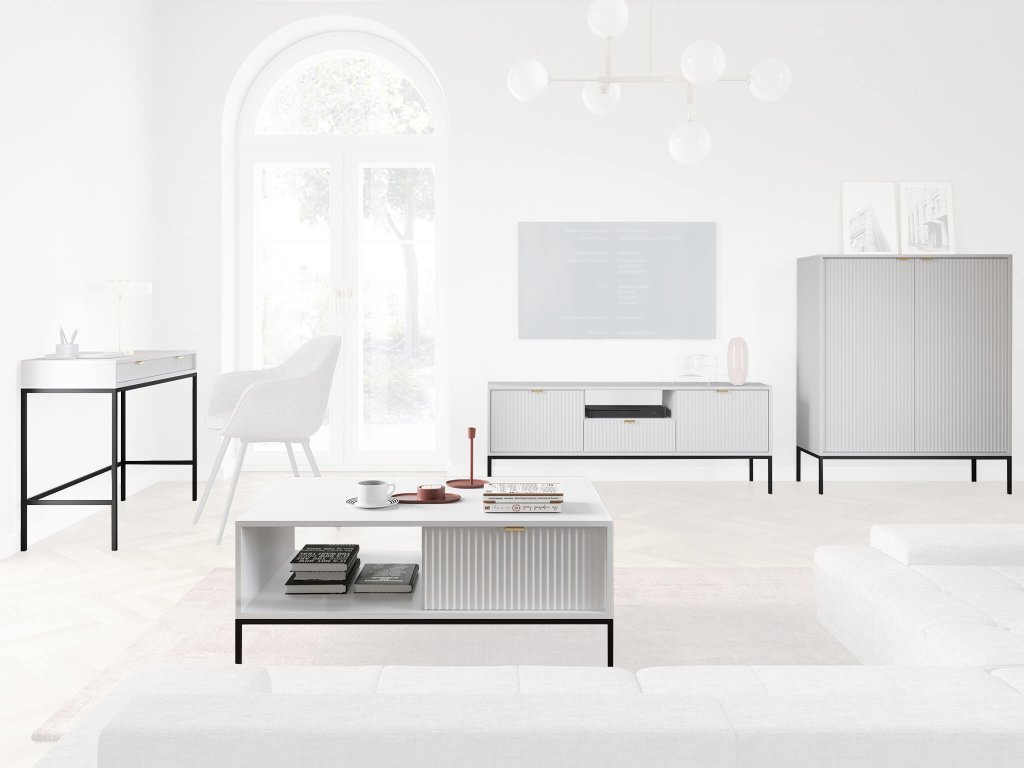 Bielu obývaciu izbu NOVA tvoria štyri krásne kúsky nábytku: toaletný (konzolový) stolík, dvojdverová komoda, TV stolík a konferenčný stolík.