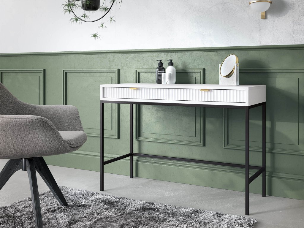 - Biely toaletný stolík Nova T104 rád poslúži ženám pri úprave zovňajšku, avšak skvelým pomocníkom môže byť aj v pracovni či obývačke ako konzolový stolík. Disponuje dvomi zásuvkami. Rozmer (šxvxh): 104 x 78 x 50 cm.