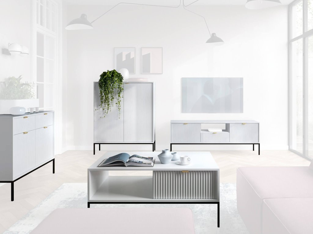 Bielu obývaciu izbu NOVA tvoria štyri krásne kúsky nábytku: komoda so zásuvkami, dvojdverová komoda, TV stolík a konferenčný stolík.