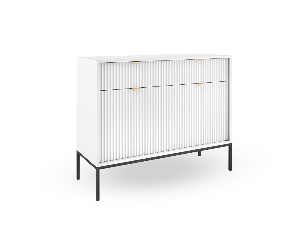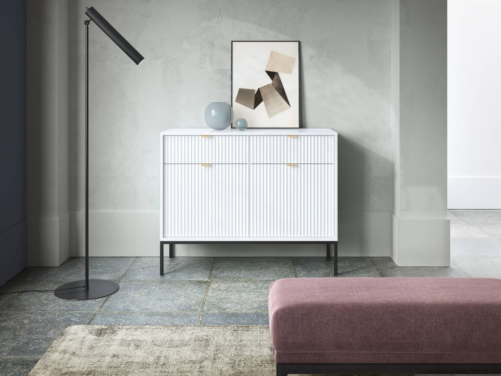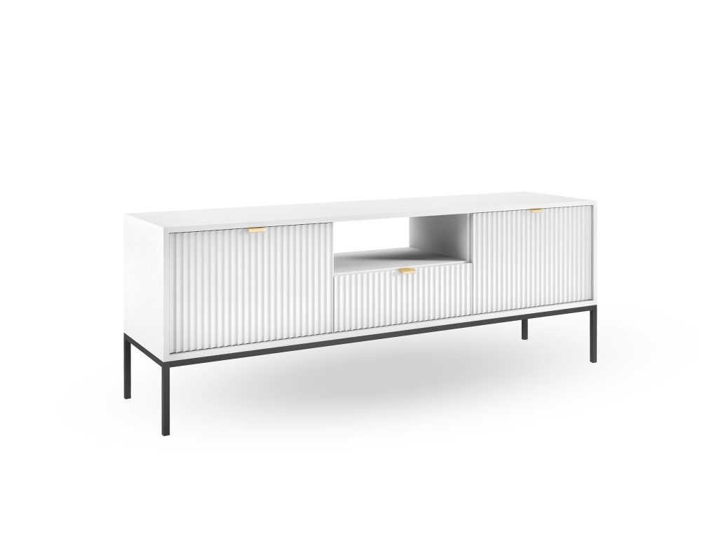 Nesmierne elegantná a štýlová kolekcia NOVA nesmie chýbať v žiadnom interiéri milovníkov moderného dizajnu. Ozdobné drážkované predné časti nábytku sa nádherne dopĺňajú s brúsenými zlatými úchytkami z hliníku. Ľahkosť nábytku dodáva čierna kovová konštrukcia s vysokými nožičkami. S kolekciou Nova si vyskladáte modernú obývačku, avšak niektoré kúsky môžete umiestniť aj do predsiene, jedálne či spálne. Korpus nábytku je tvorený laminovanou DTD doskou, kým drážkované čelá nábytku tvorí kvalitná MDF doska.