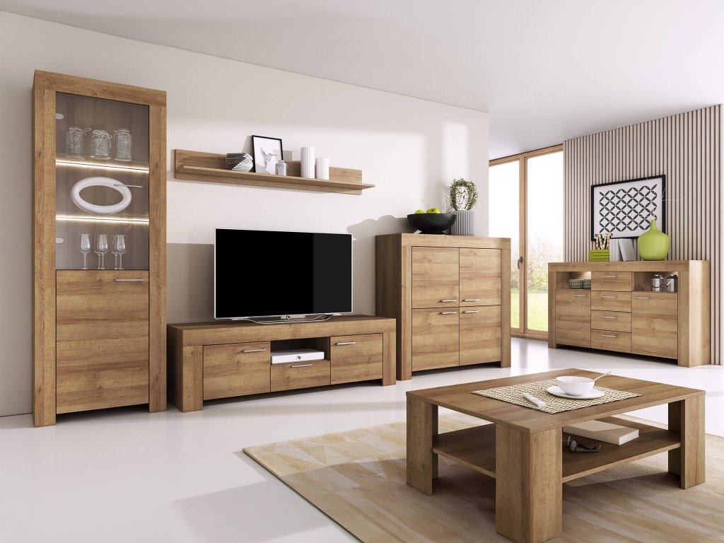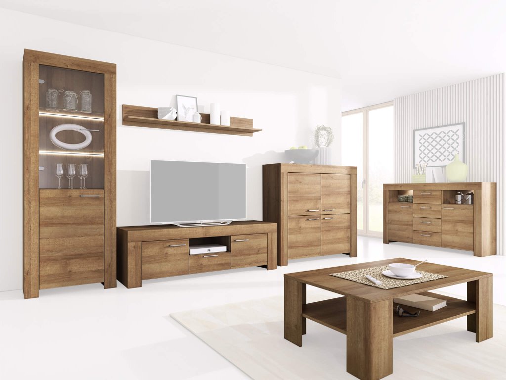 Obývacia izba Sky pozostáva zo šiestich kusov nábytku: Dve komody, vitrína, TV stolík, konferenčný stolík a polica.