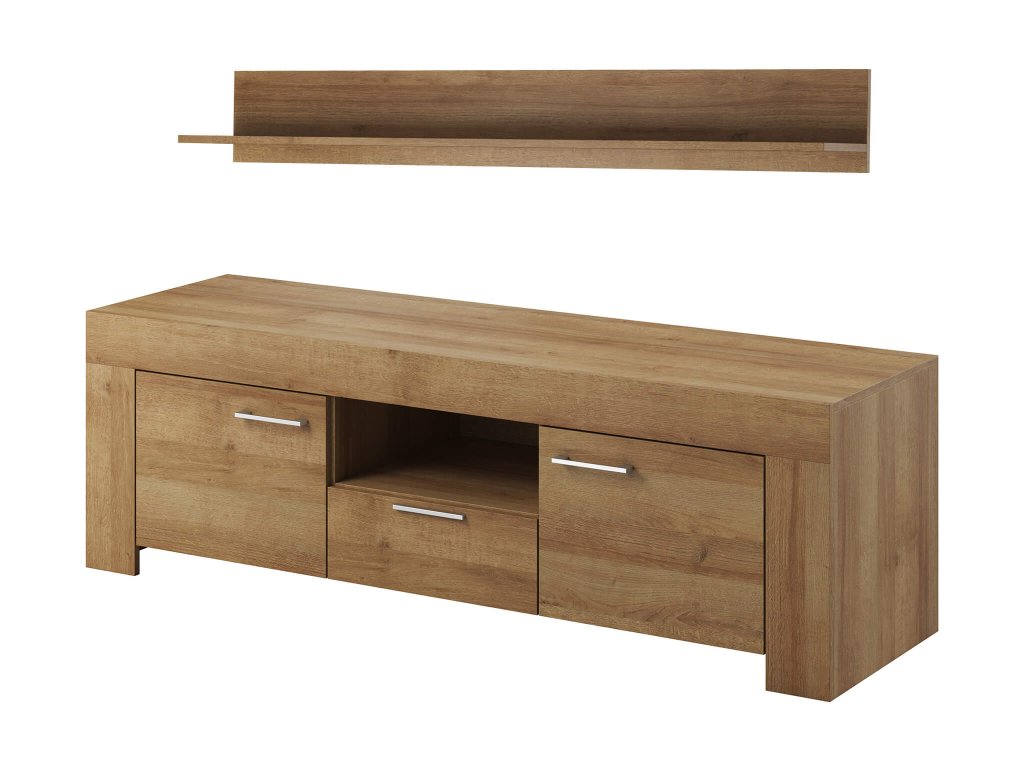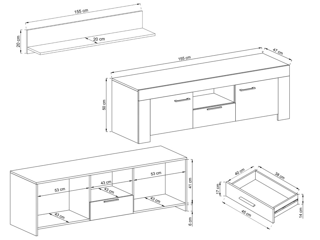 - TV stolík Sky obsahuje dve skrinky po stranách, jednu zásuvku v strede a otvorenú policu na elektroniku. Rozmery (šxvxh): 155 x 50 x 47 cm.