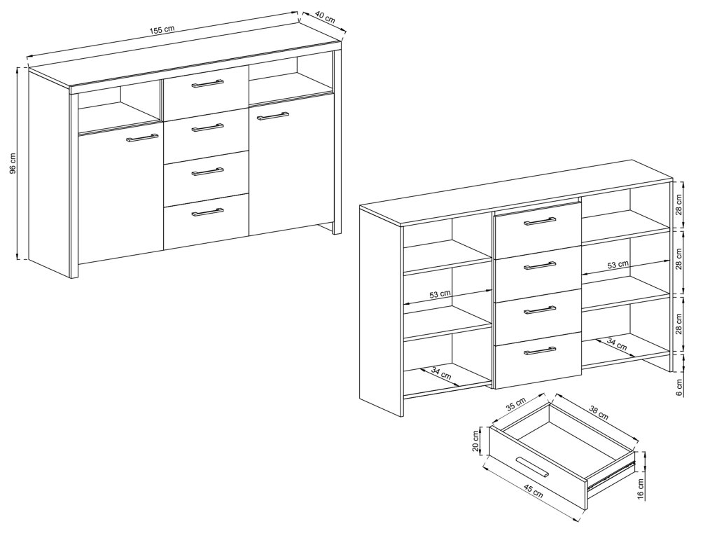 - Komoda Sky 155 má až štyri zásuvky v strede, dve skrinky s dvomi policami po stranách a takisto dve otvorené police vo vrchnej časti. Rozmery (šxvxd): 155 x 96 x 40 cm.
