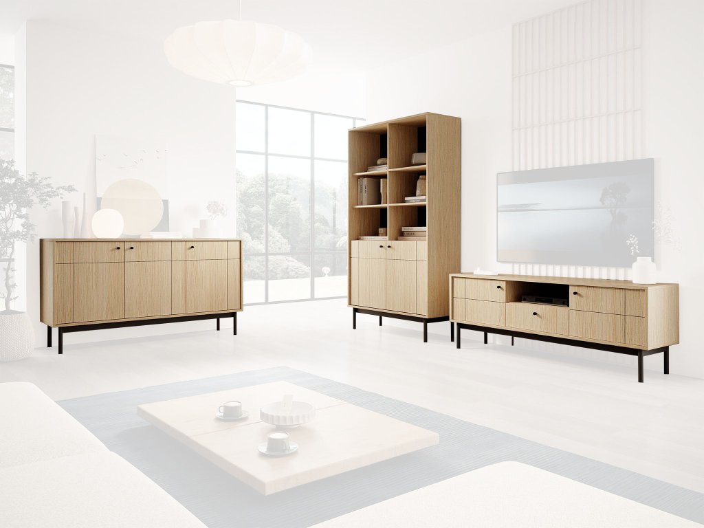 Moderná obývacia stena Japandi pozostáva z troch kusov nábytku: komoda K154, policový regál R104, TV stolík RTV 154