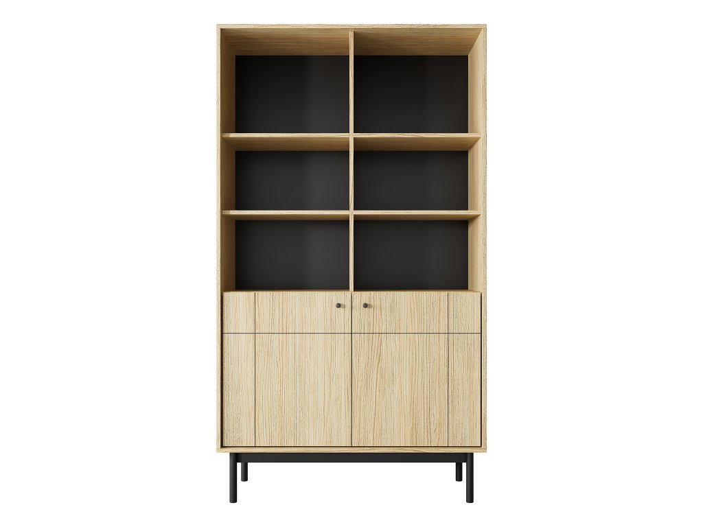 - Policový regál R104: V hornej časti sa nachádzajú štyri otvorené police a v spodnej časti sú dvierka s poličkami. Rozmery (šxvxd): 103,4 x 184,6 x 39 cm