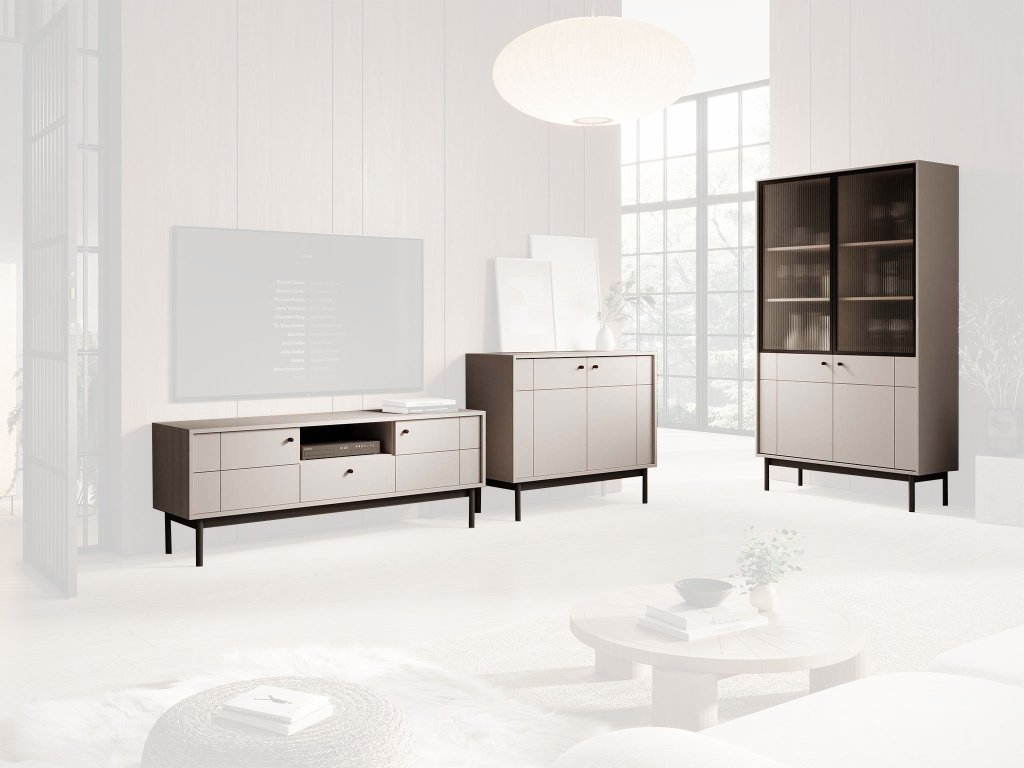 Kolekcia Japandi v dvoch farebných prevedeniach dub linea a kašmír prináša harmóniu prírodných materiálov a moderného dizajnu. Nábytok v tejto kolekcii je vyrobený zo 16 mm hrubej laminátovej dosky, ktorá je zakončená odolnou ABS hranou pre dlhšiu životnosť a ochranu pred opotrebením. Všetky kúsky stoja na vysokých čiernych drevených nožičkách, ktoré dodávajú nábytku ľahkosť a moderný vzhľad. Kovové čierne úchyty v gombíkovom tvare pridávajú sofistikovaný dotyk. Pánty značky Hafele s tichým zatváraním zaisťujú pohodlné používanie. Kolekcia zahŕňa TV stolík, vitrínu, regál a dve komody, ktoré sú ideálnou voľbou pre štýlový a moderný interiér.