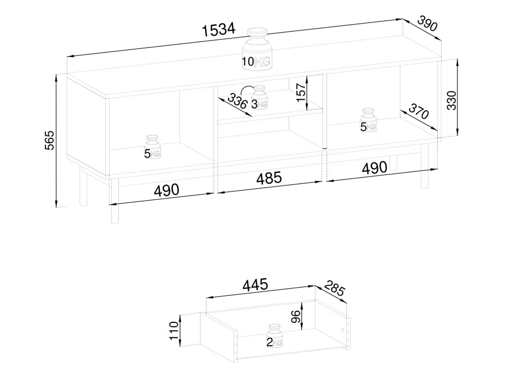 - TV stolík RTV154: Má dvierka po stranách, stredový šuflík a otvorený priestor na elektroniku. Rozmery (šxvxd): 153,4 x 56,5 x 39 cm