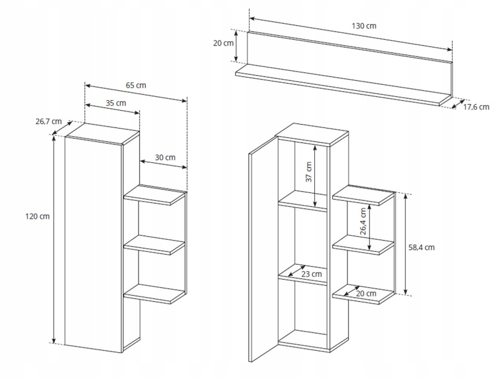 - Sada dvoch skriniek na stenu - každá skrinka je tvorená troma otvorenými policami a jednými dvierkami, za ktorými sa ukrývajú ďalšie dve police. Rozmery (šxvxh): 65 x 120 x 26,7 cm.