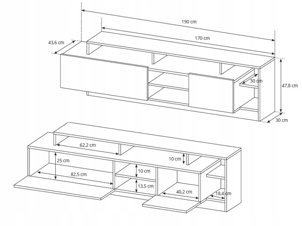 - Tv stolík je tvorený dvoma otvorenými policami vo svojom strede, ďalšími dvoma otvorenými policami na svojej pravej strane, dvoma dvierkami, za ktorými sa ukrýva priehradka a aj vrchné dosky stolíka, môžu byť využité ako odkladací priestor. Rozmery (šxvxh): 190 x 47,8 x 43,6 cm.