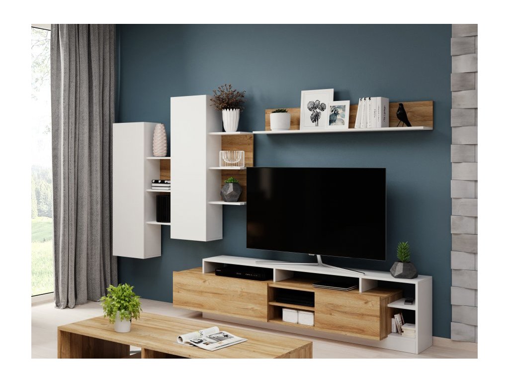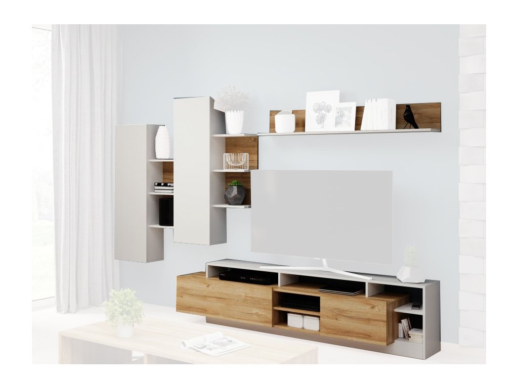 Obývacia stena ALVA pozostáva z 3 kusov nábytku: sada skriniek na stenu, TV stolík a polica